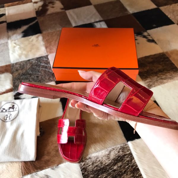 HERM Oran Slide Sandals In Red Shiny Niloticus Crocodile Skin