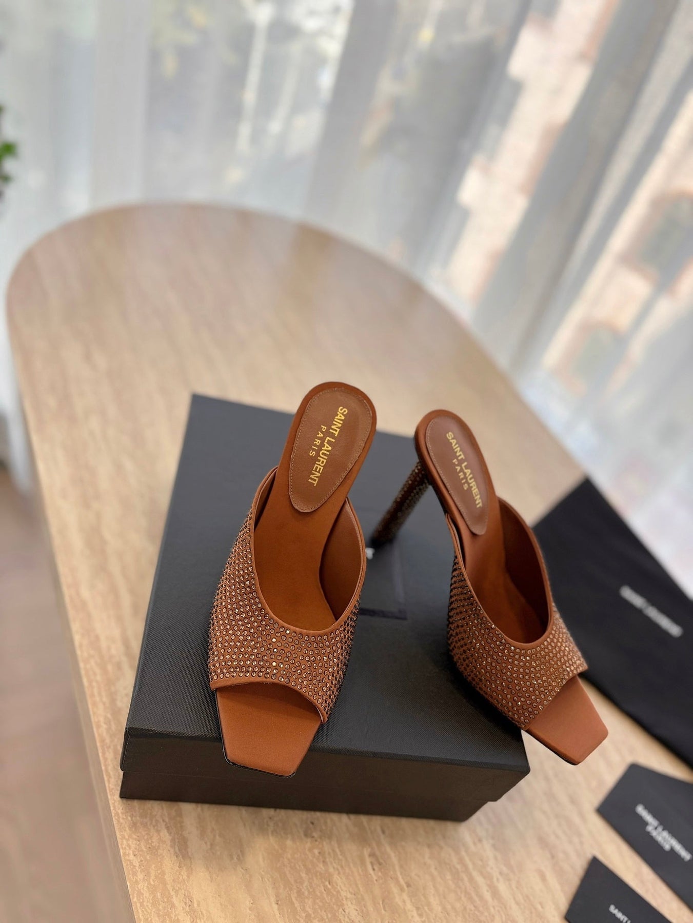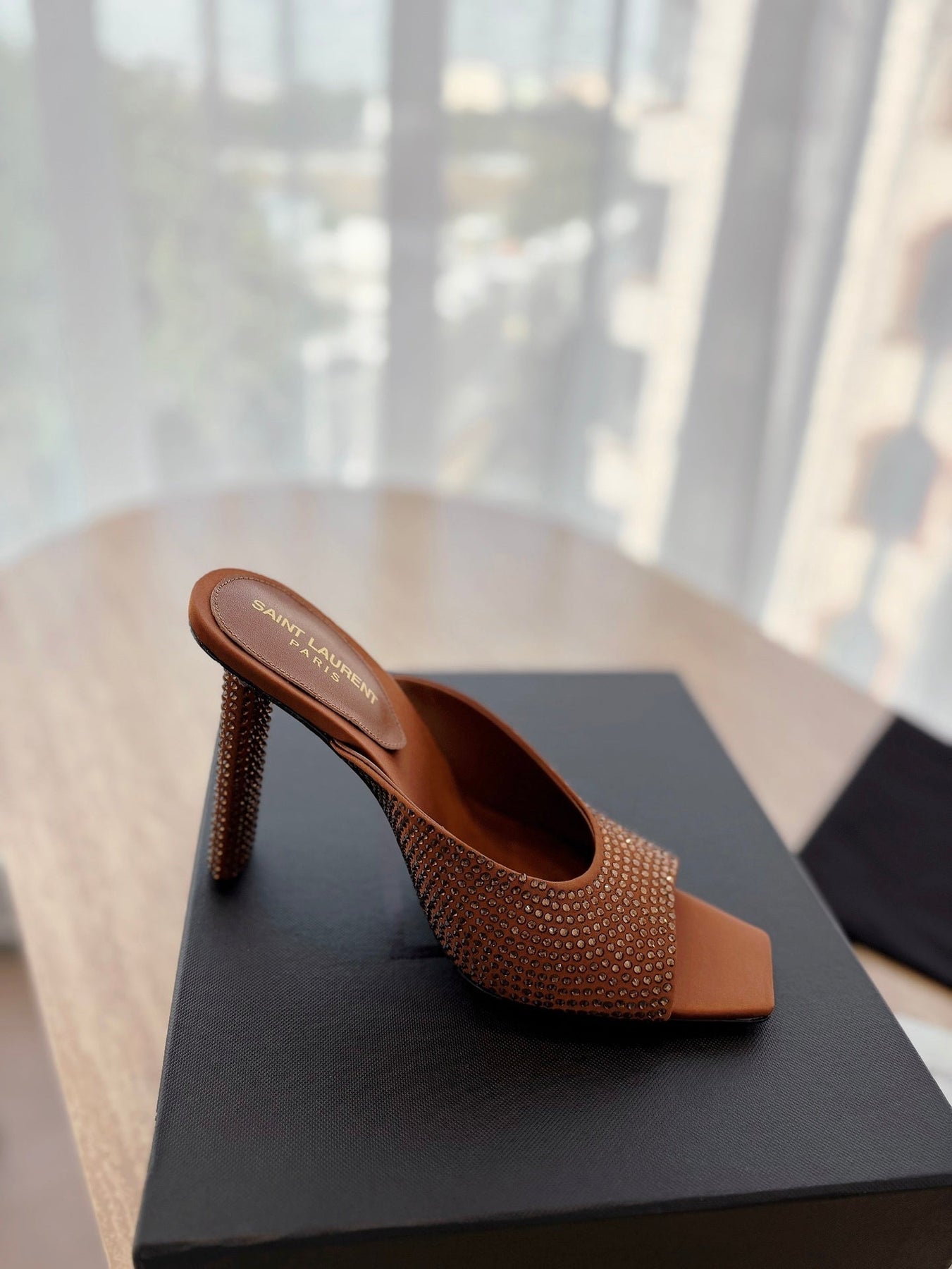 HIGH HEEL BLONDE MULE 10 CM IN BRONZE BROWN SATIN WITH RHINESTONES