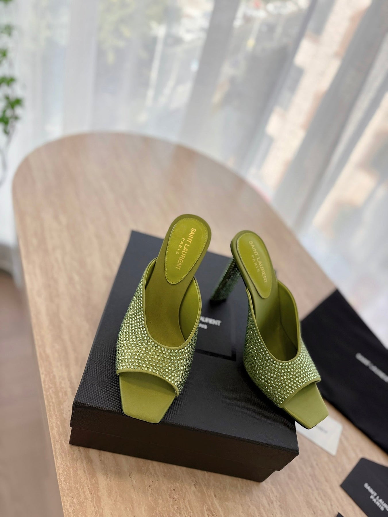HIGH HEEL BLONDE MULE 10 CM IN OLIVE GREEN SATIN WITH RHINESTONES