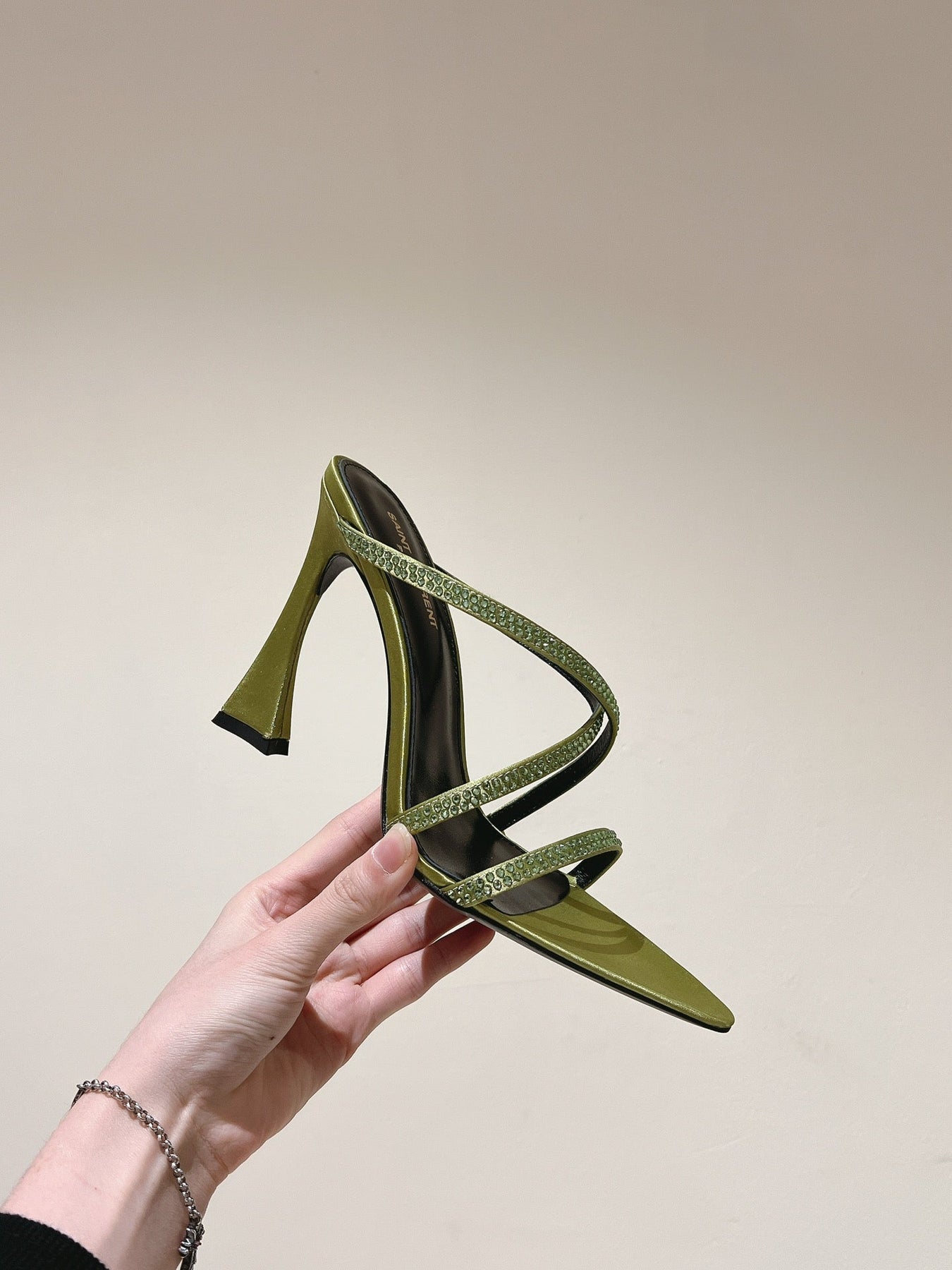 HIGH HEEL MULE 10 CM IN OLIVE GREEN SATIN WITH RHINESTONES