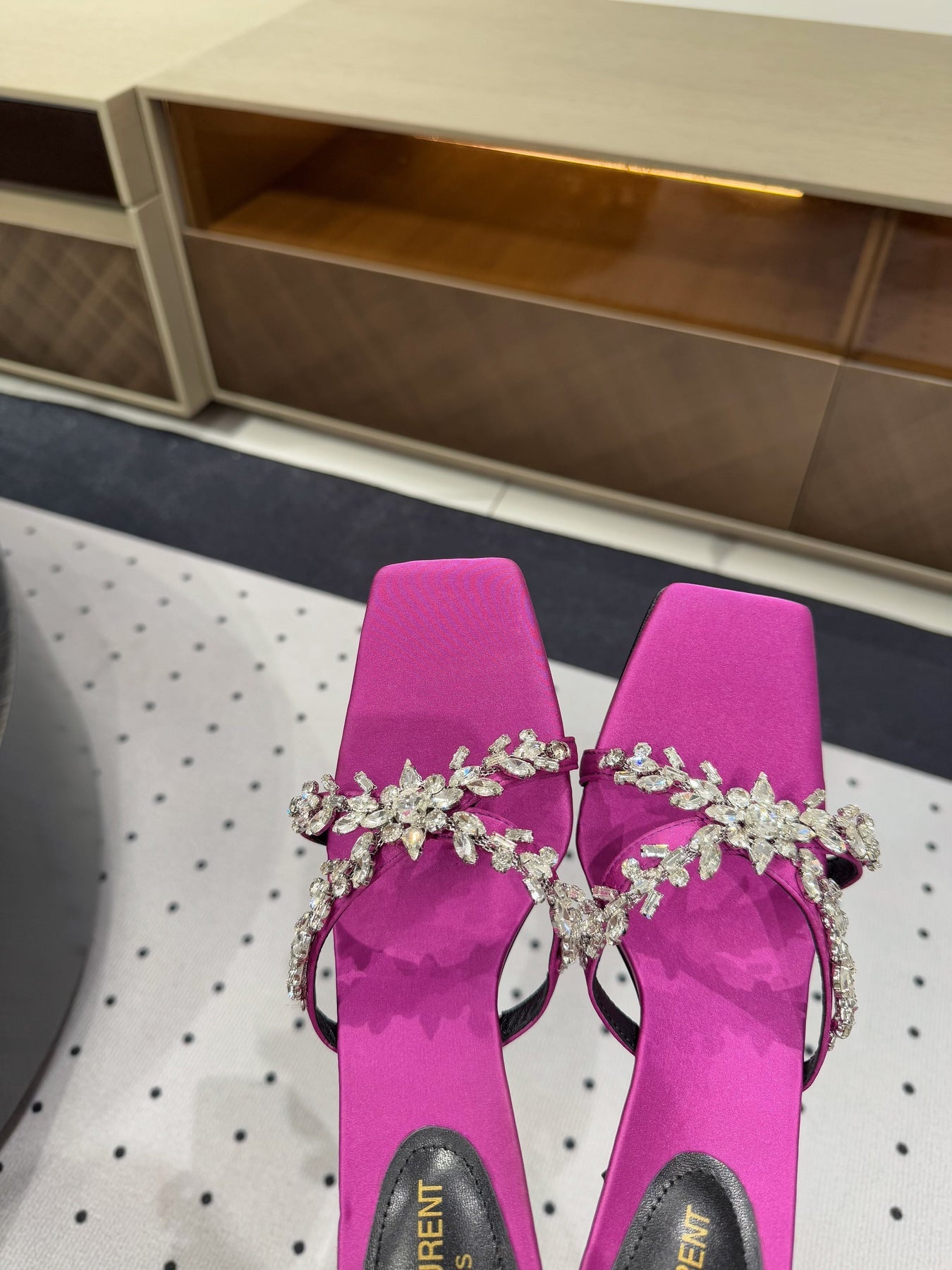 HIGH RHINESTONE CROSS STRAP MULES IN MAGENTA PINK SILK