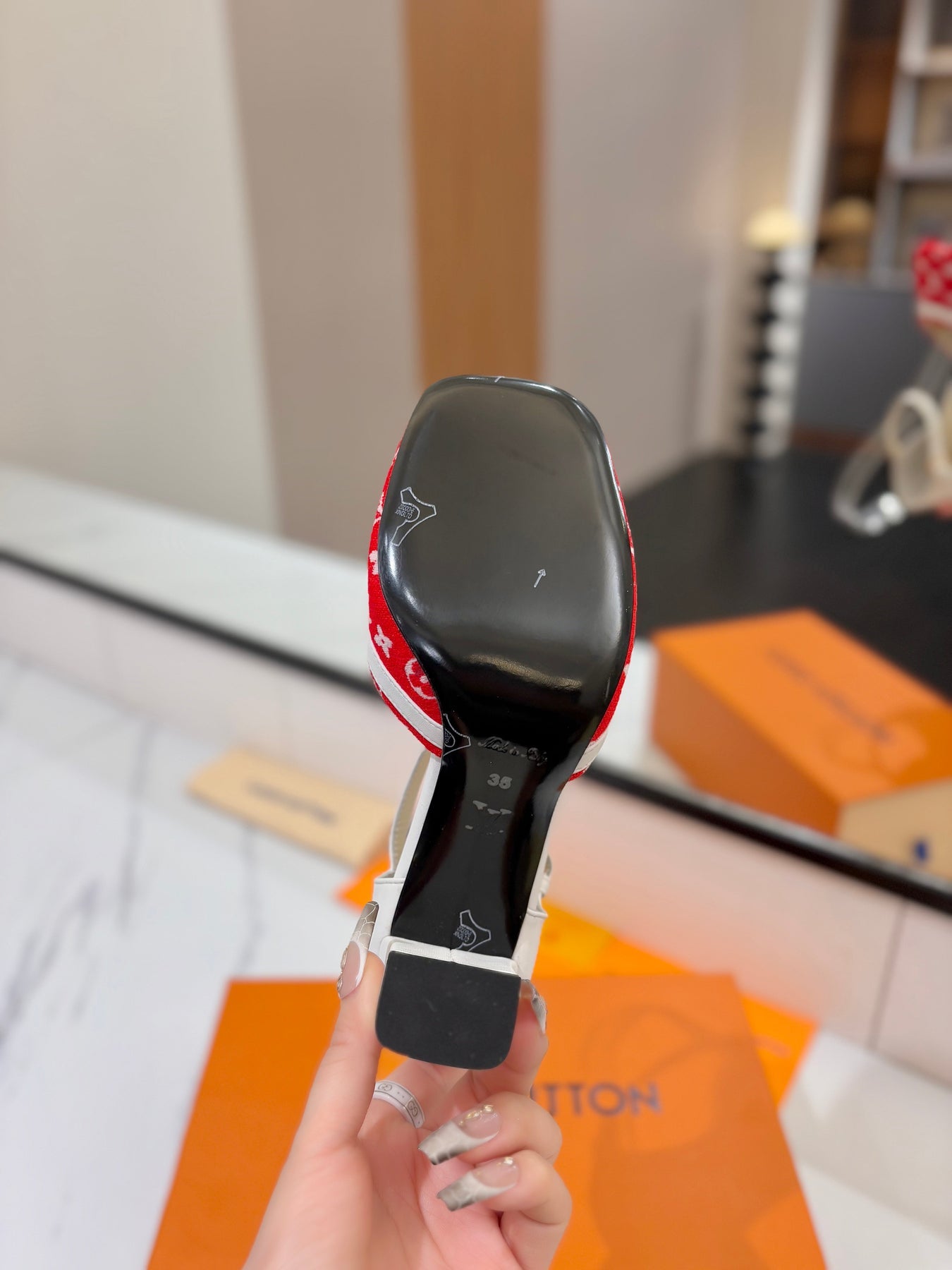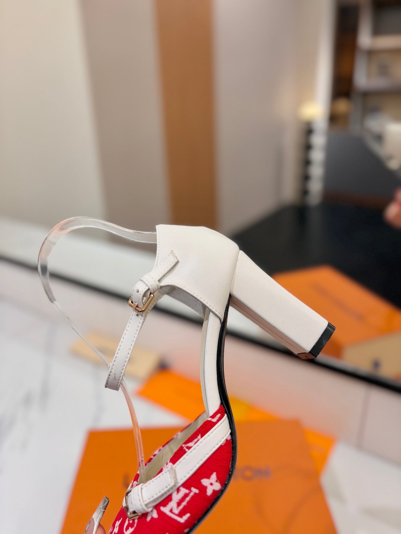 HIGH SANDALS 8 CM IN CHERRY RED MONOGRAM DENIM AND WHITE CALFSKIN