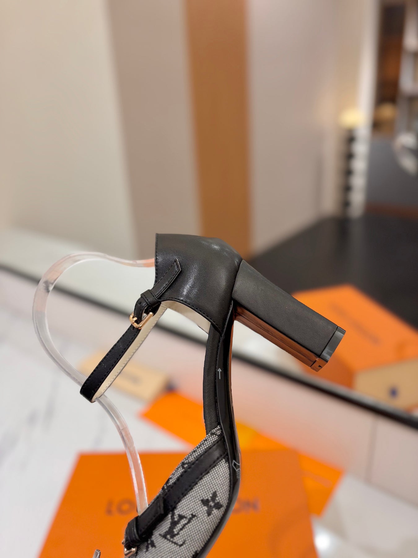 HIGH SANDALS 8 CM IN COOL GRAY MONOGRAM DENIM AND BLACK CALFSKIN