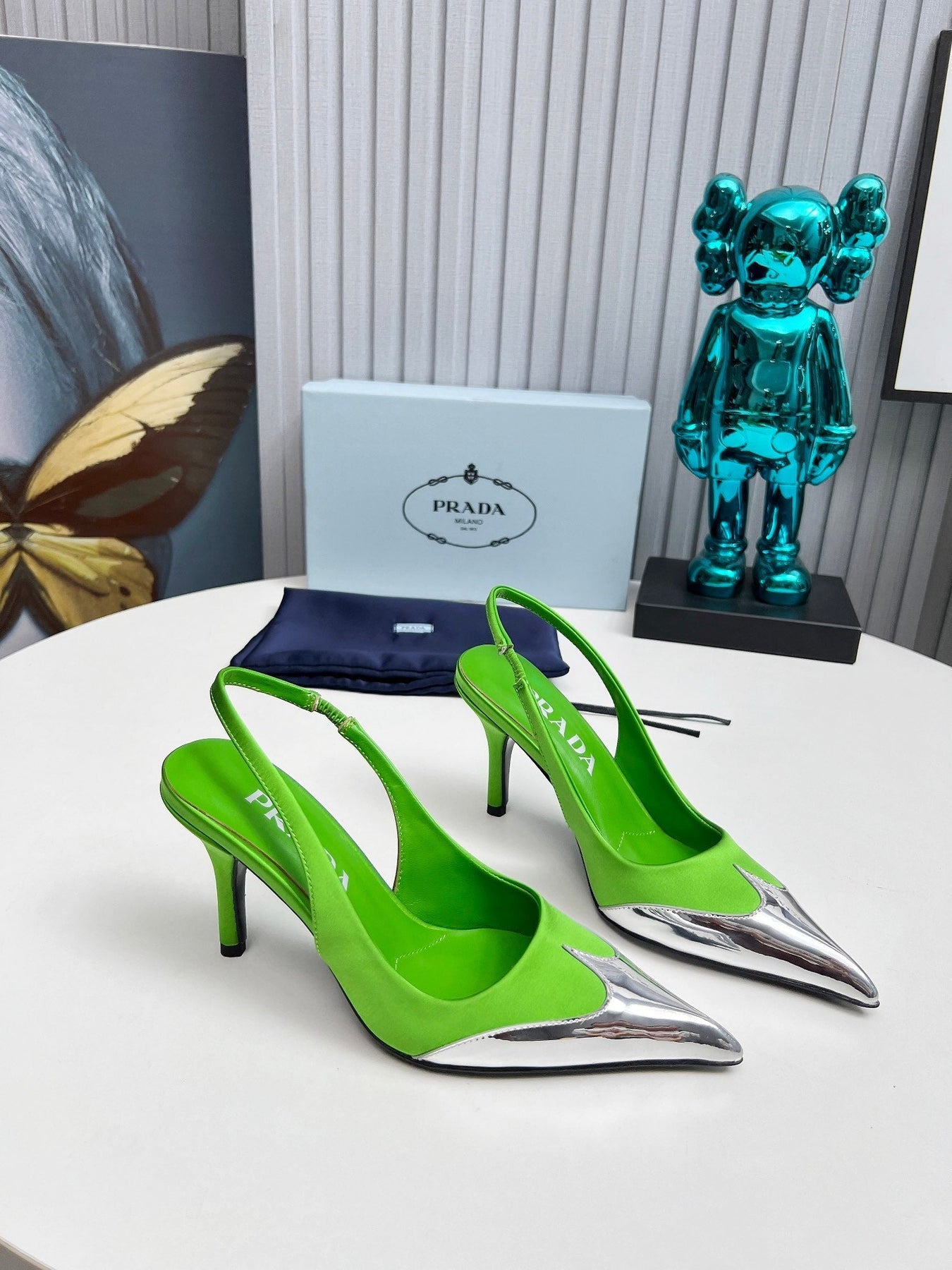 HIGH SLING BACK PUMPS IN SILVER MIX LIME GREEN SATIN