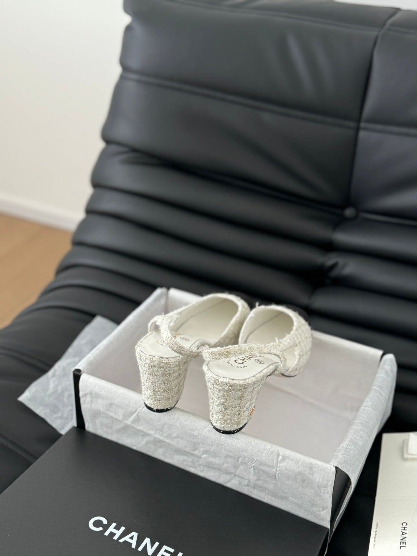 HIGH SLINGBACK IN WHITE TWEED AND BLACK LAMBSKIN