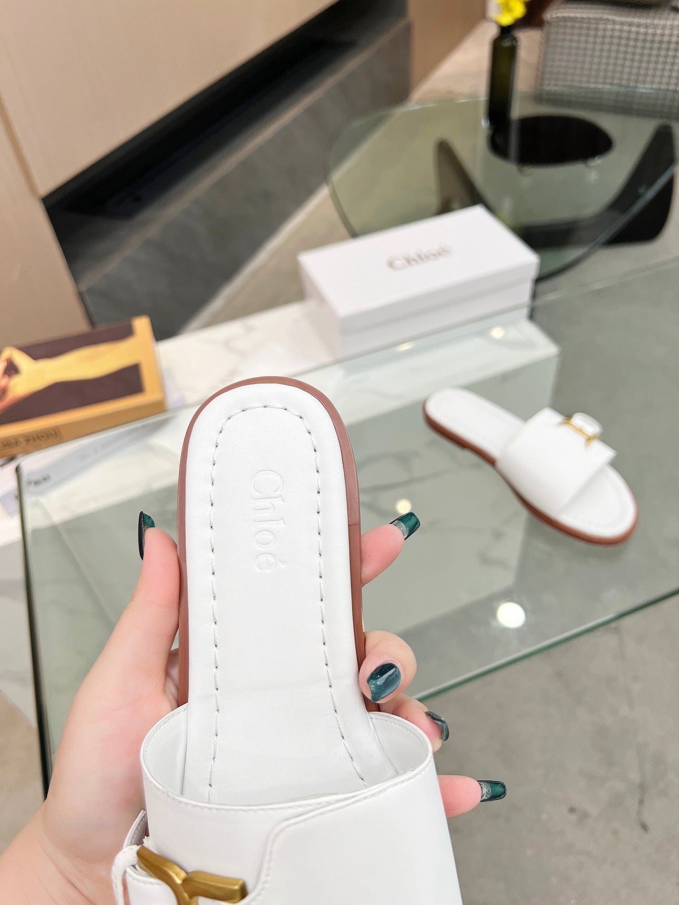 HLOE MARCIE SLIDE IN WHITE CALFSKIN WITH GOLD HARDWARE
