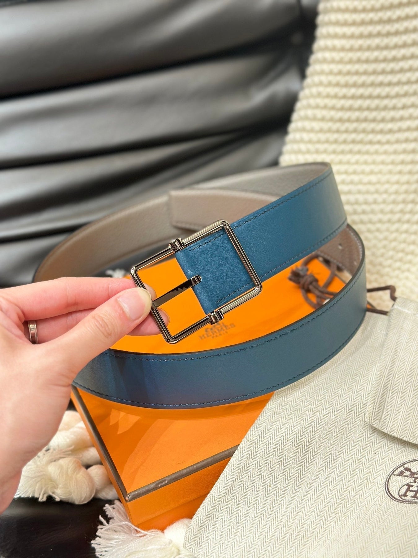 HM HADRIEN 38MM REVERSIBLE BELT GREY AND AEGEAN BLUE LEATHER SILVER BUCKLE