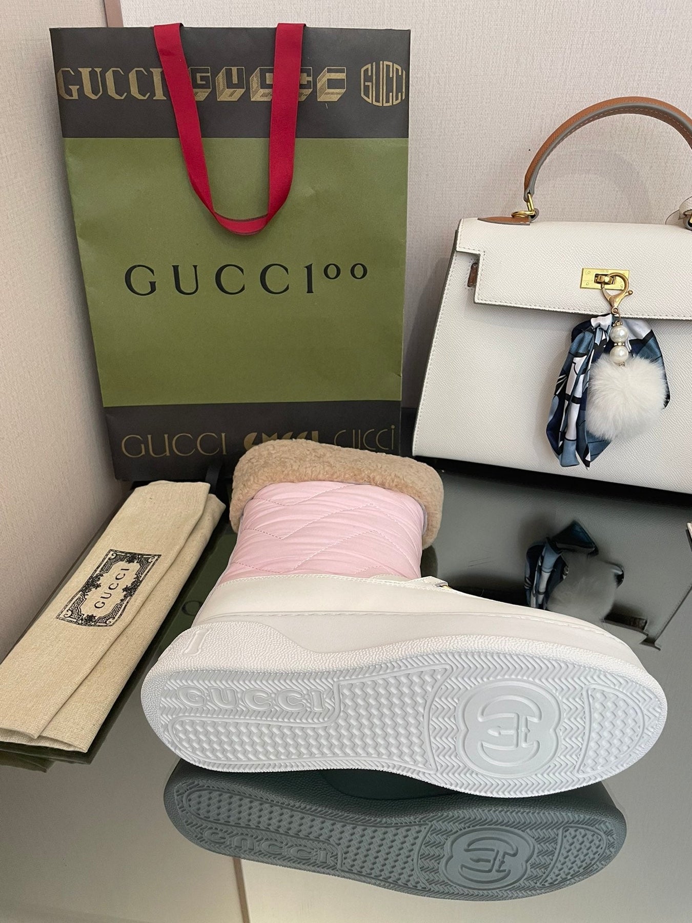 HORSEBIT ANKLE BOOTS WITH MERINO TRIM IN LIGHT PINK NYLON MIX WHITE CALFSKIN