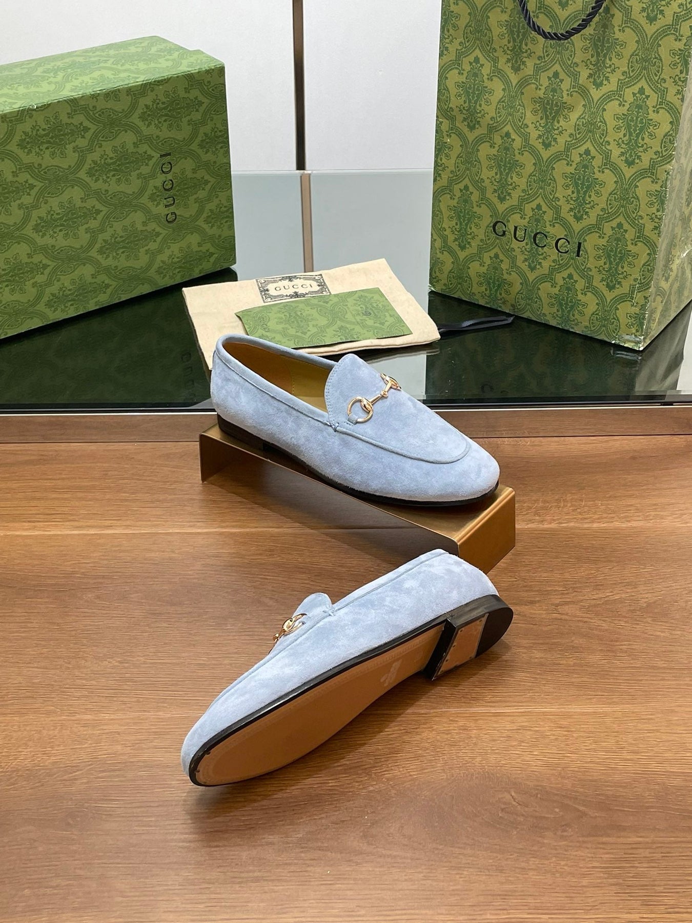HORSEBIT LOAFER IN LIGHT BLUE SUEDE WITH GOLD HARDWARE