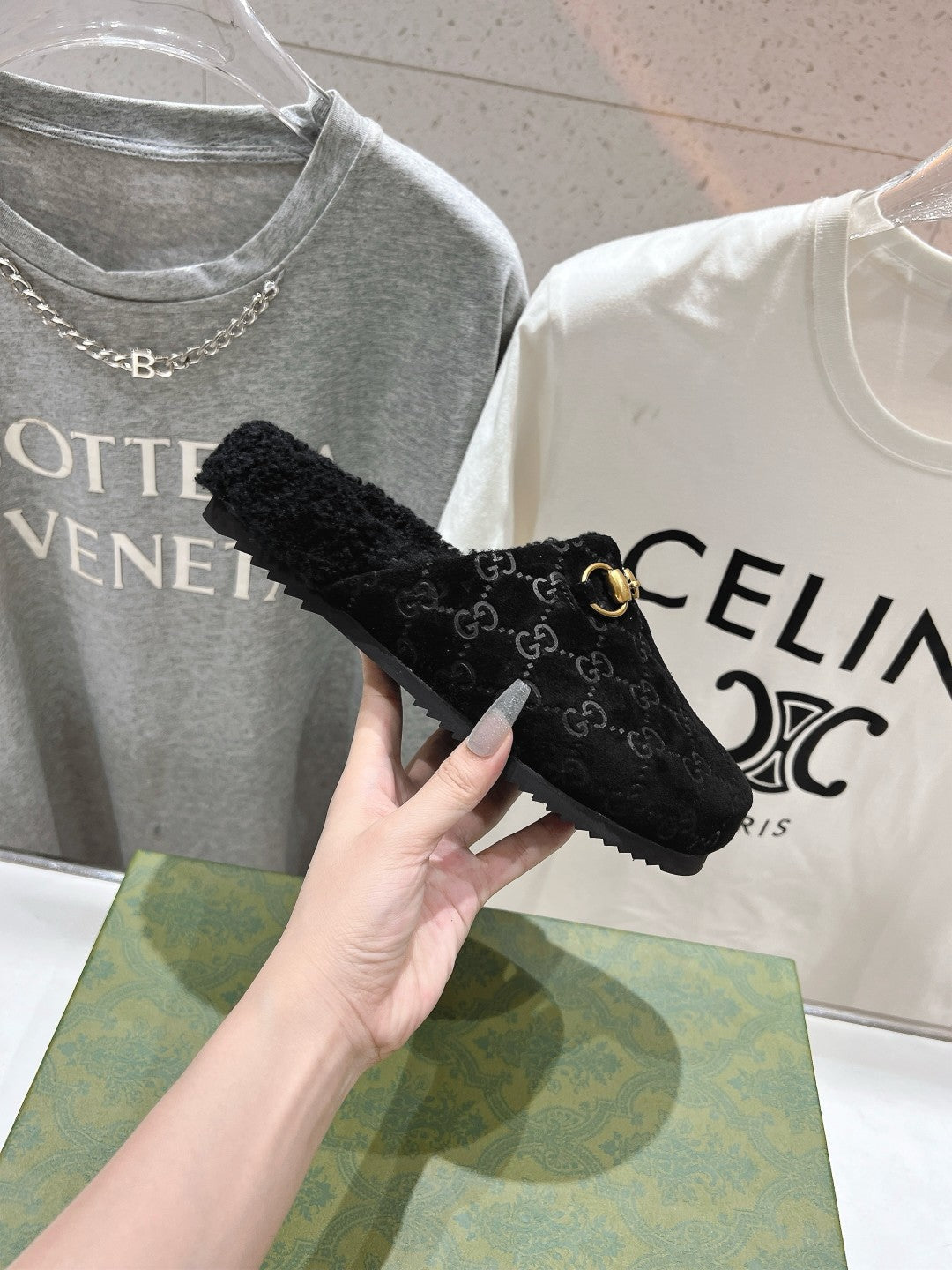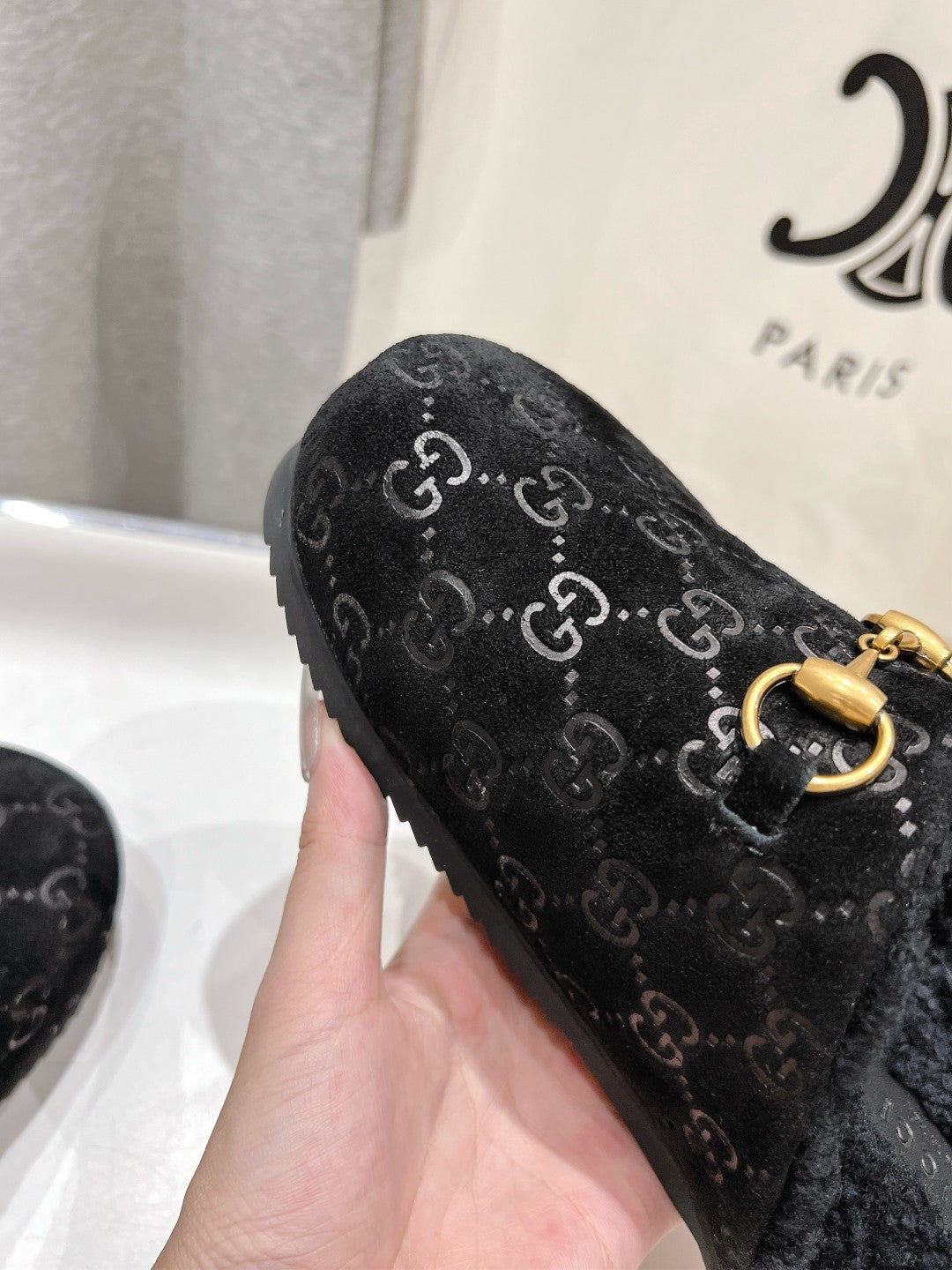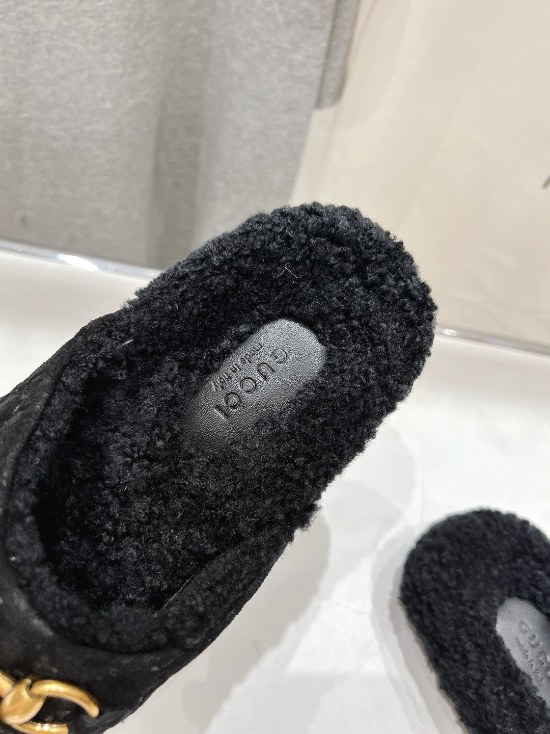 HORSEBIT MULE IN BLACK EMBOSSED SUEDE AND FLEECE LINING