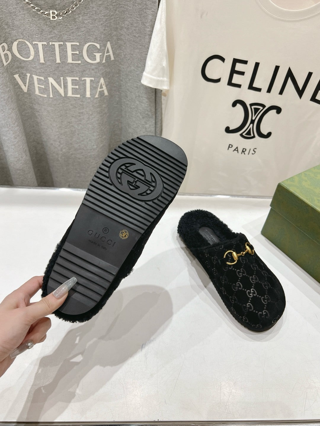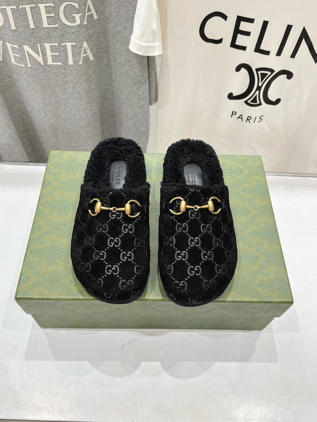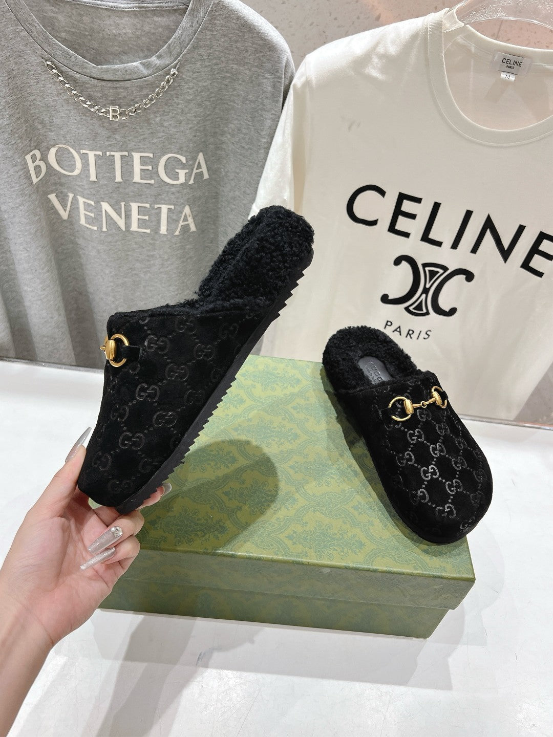HORSEBIT MULE IN BLACK EMBOSSED SUEDE AND FLEECE LINING
