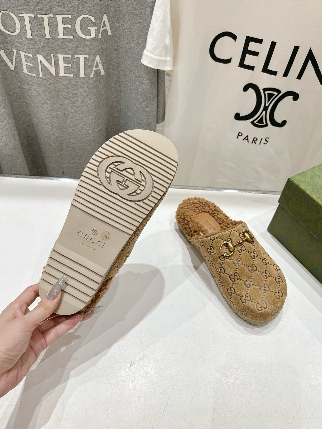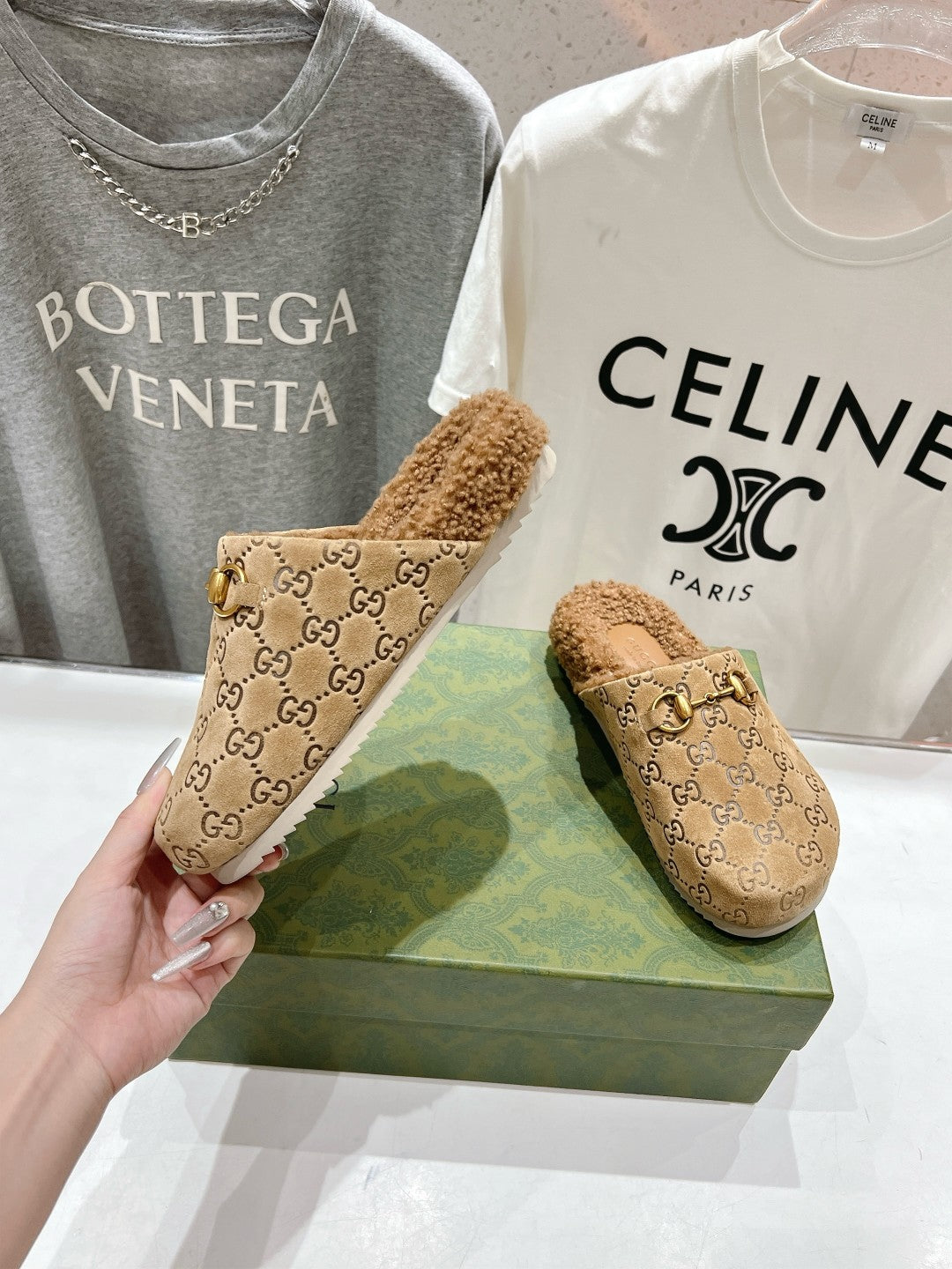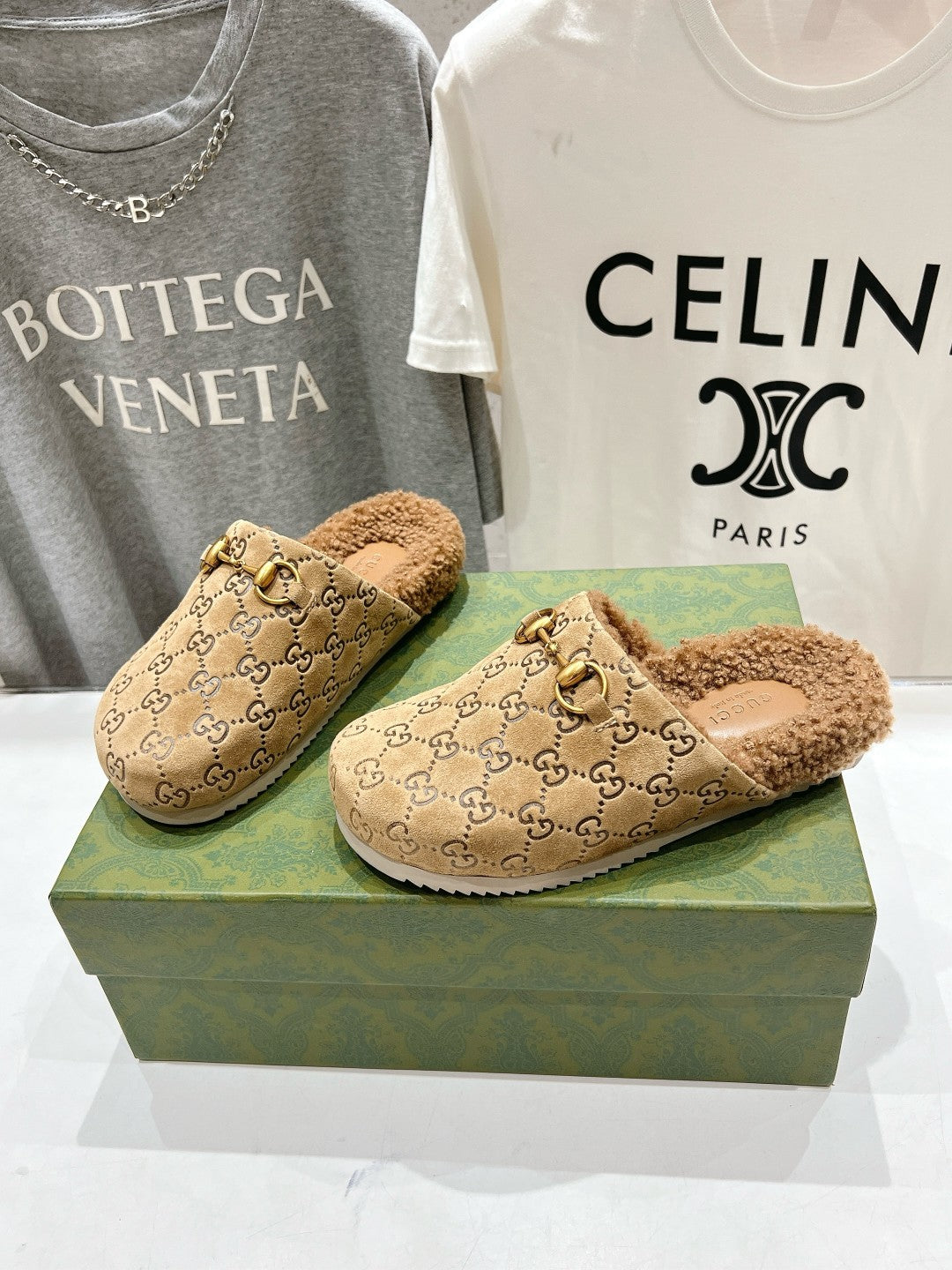 HORSEBIT MULE IN CAMEL EMBOSSED SUEDE AND FLEECE LINING
