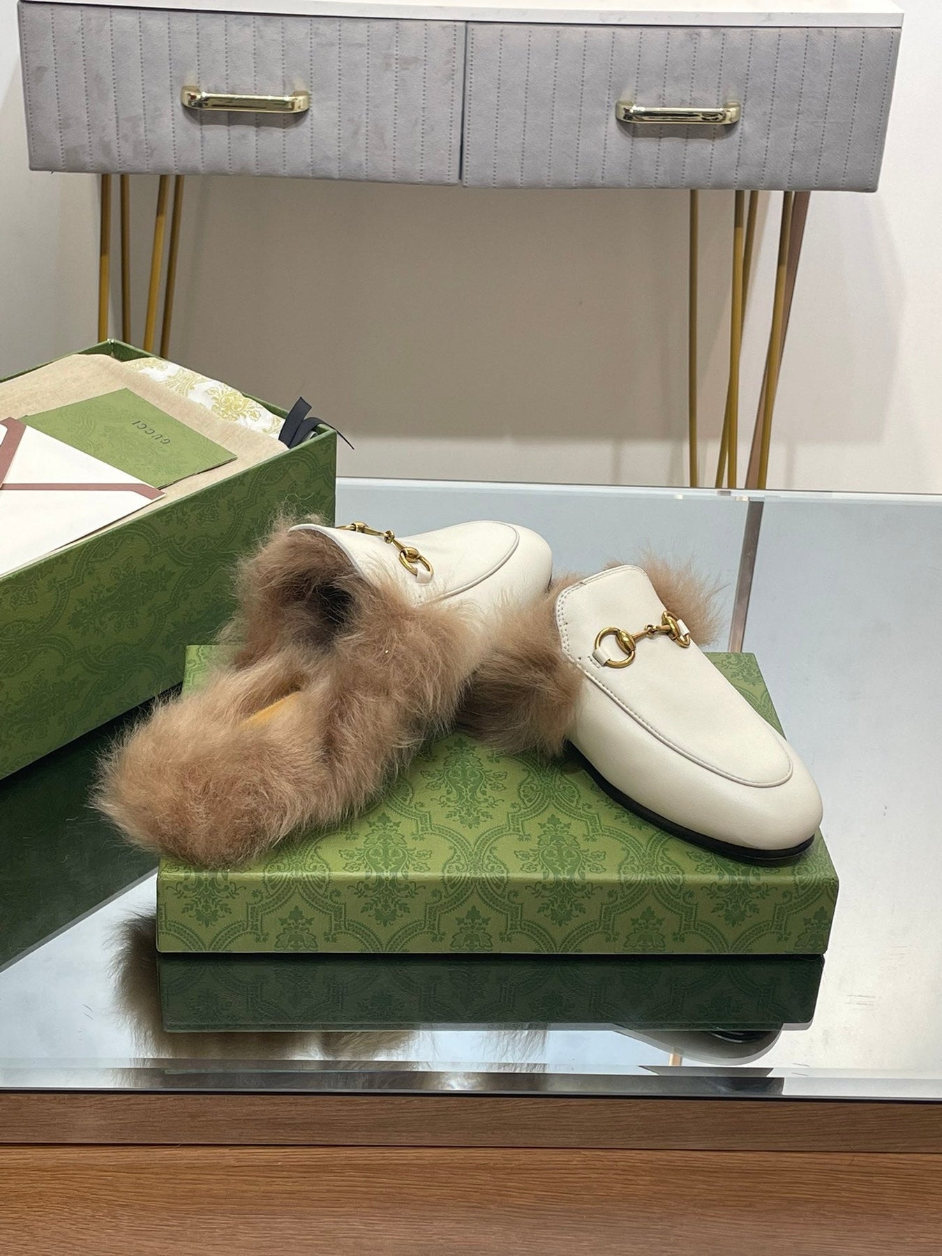 HORSEBIT MULE IN WHITE CALFSKIN AND LAMB WOOL LINING