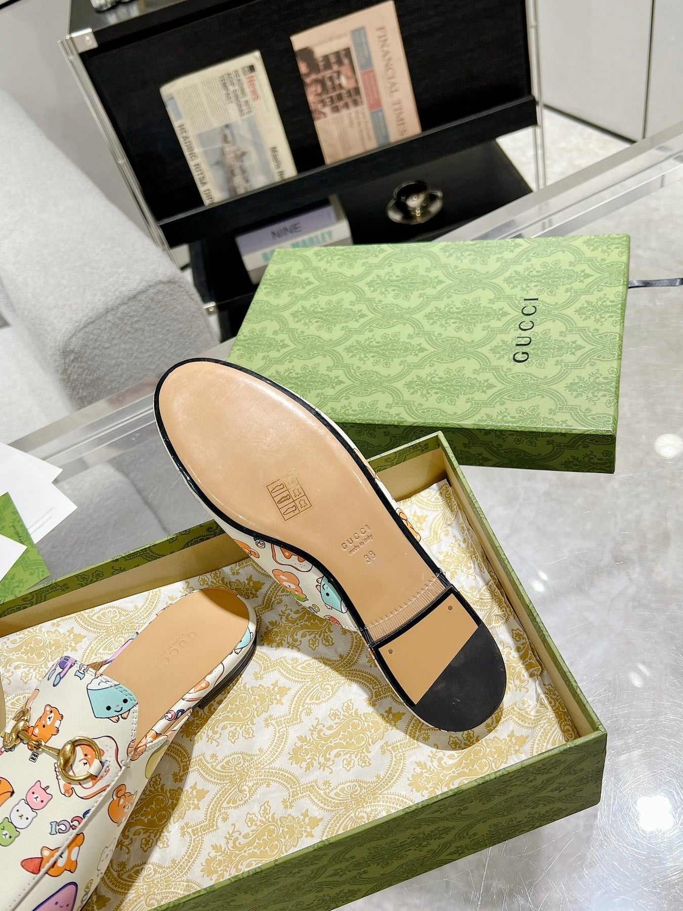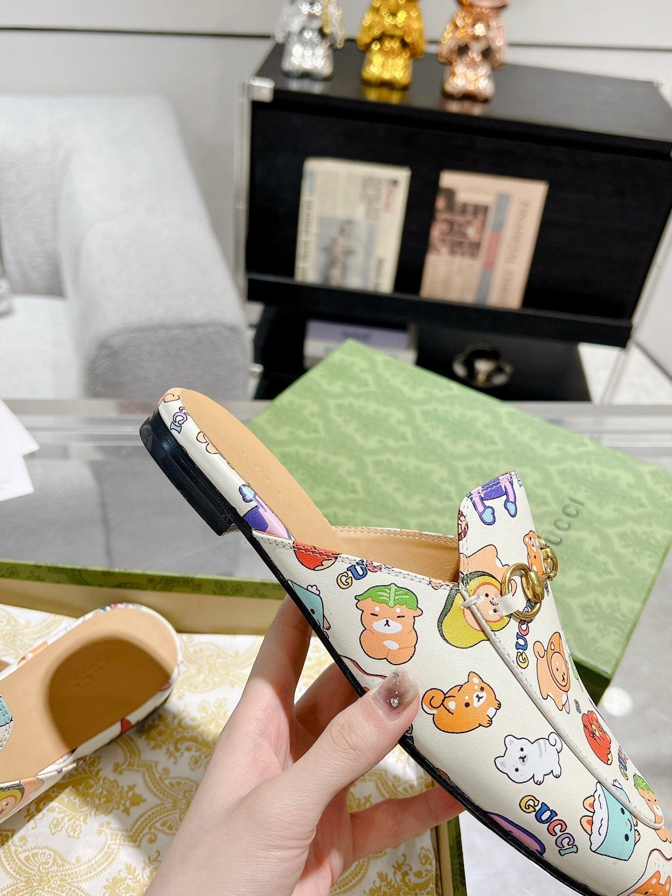 HORSEBIT SLIPPER MULE WITH CUTE ANIMAL PRINT IN WHITE CALFSKIN
