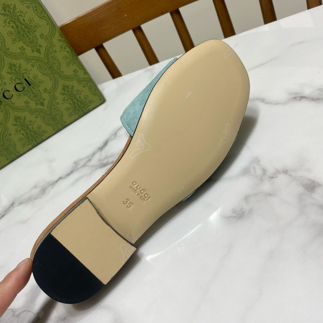INTERLOCKING G SLIDE SANDAL IN MORNING BLUE SUEDE AND BROWN SHEEPSKIN LINING