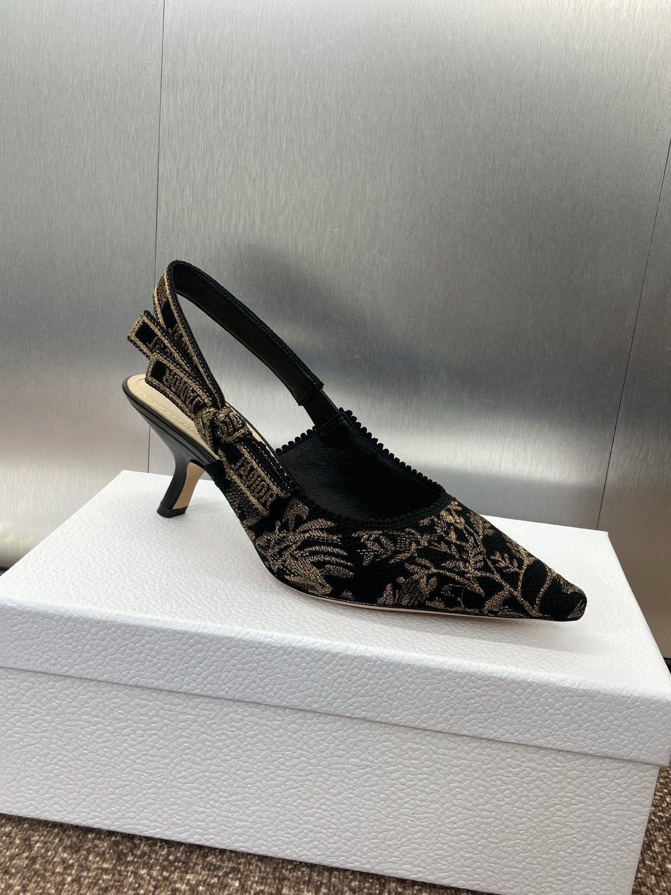 J'ADIOR HIGH SLINGBACK PUMP BLACK AND GOLD-TONE MILLEFIORI JACQUARD 65 MM