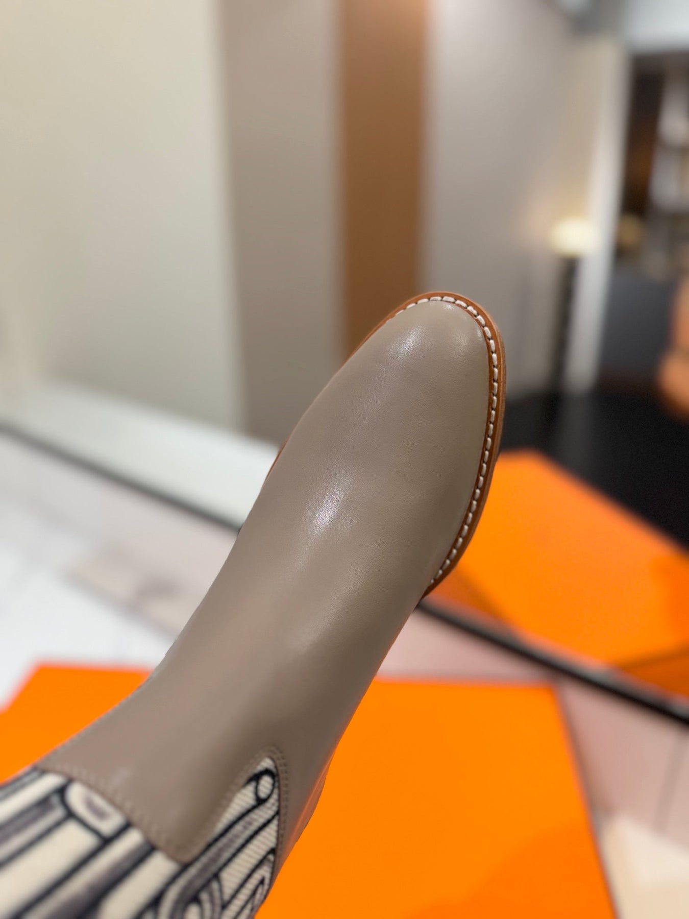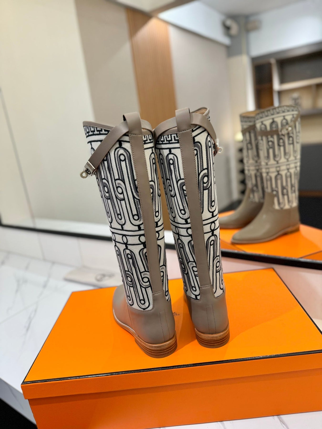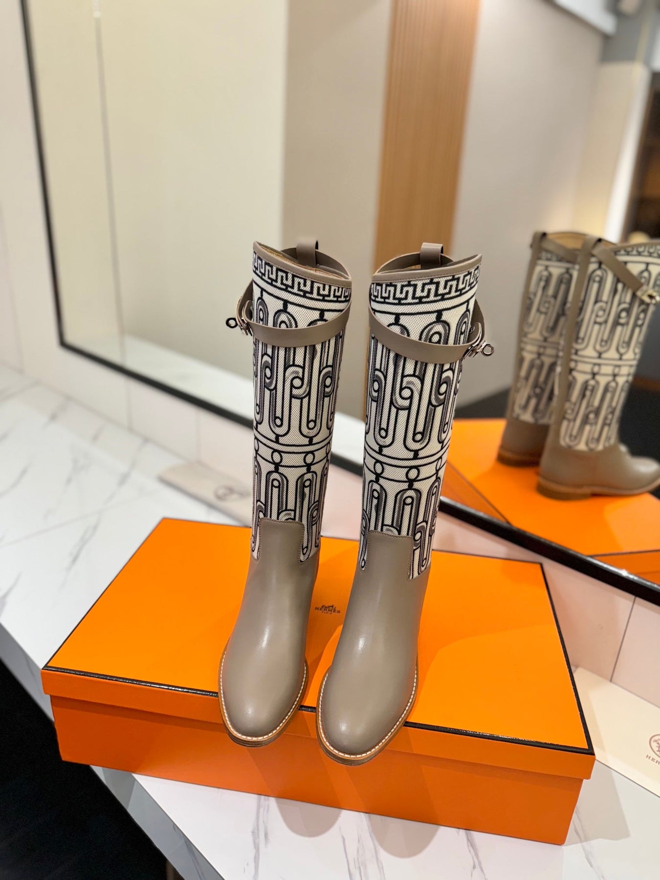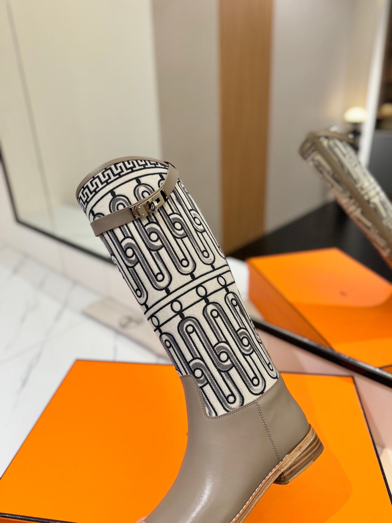 JUMPING BOOT 2 CM IN PASTEL GRAY CALFSKIN AND BLACK MIX WHITE FABRIC