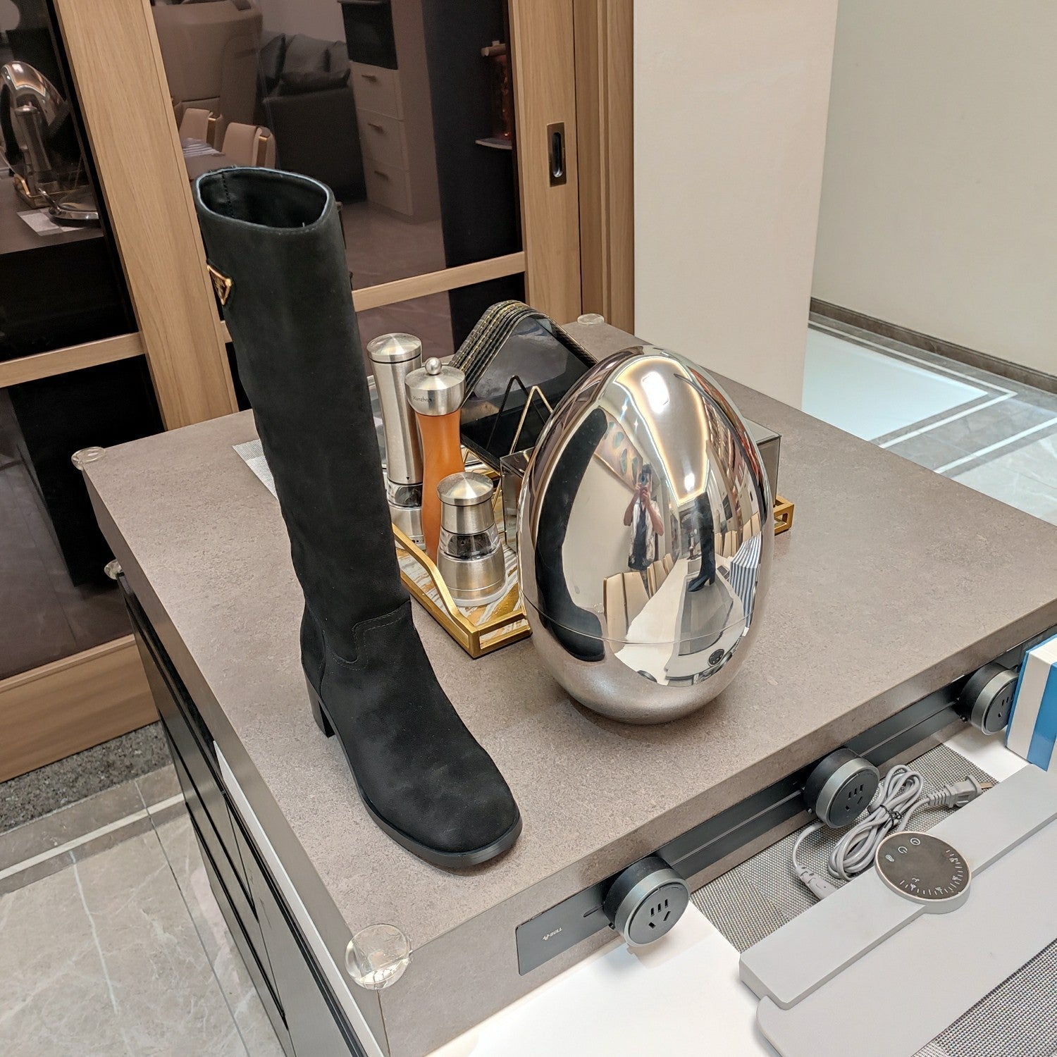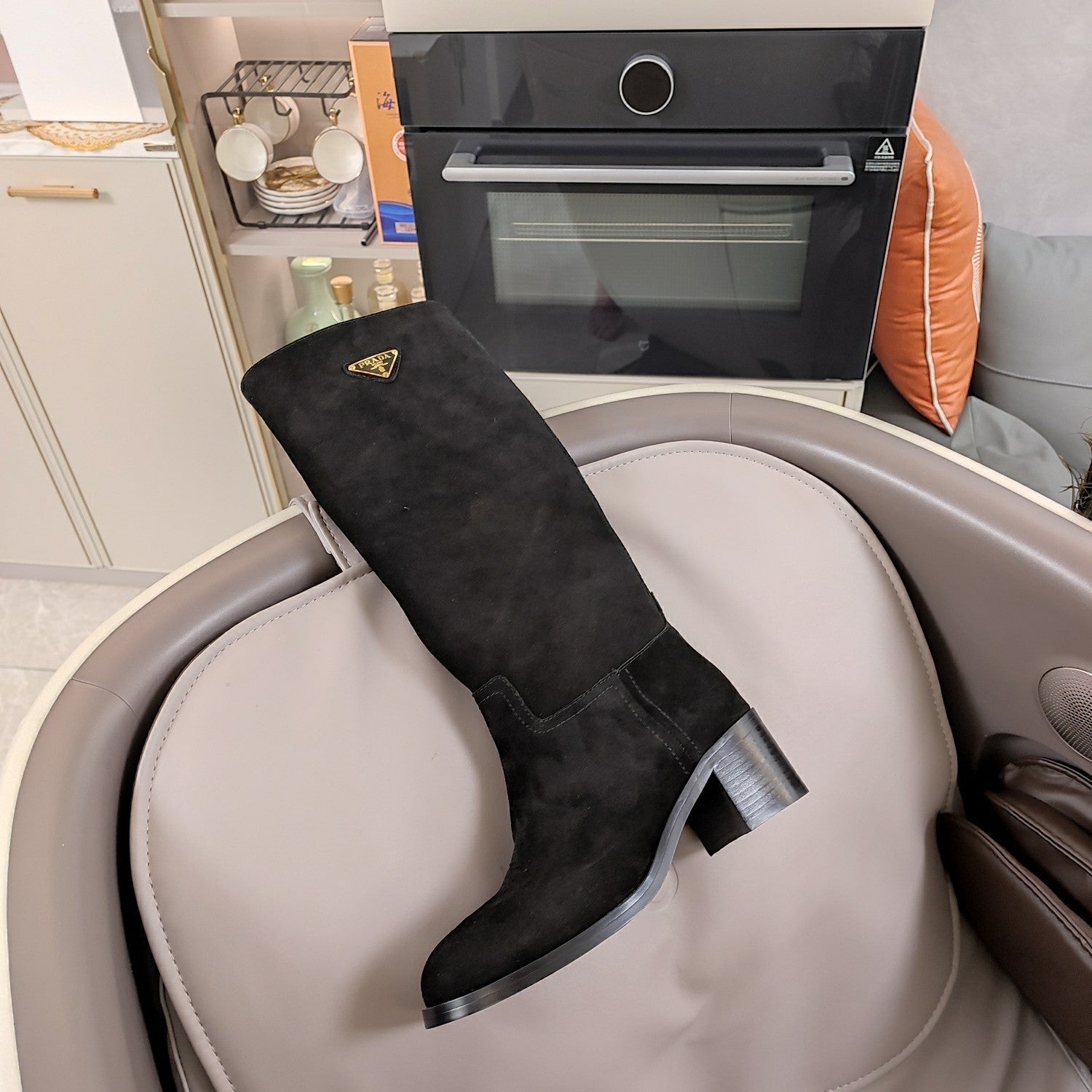 KNEE BOOTS WITH TRIANGLE LOGO IN BLACK SUEDE