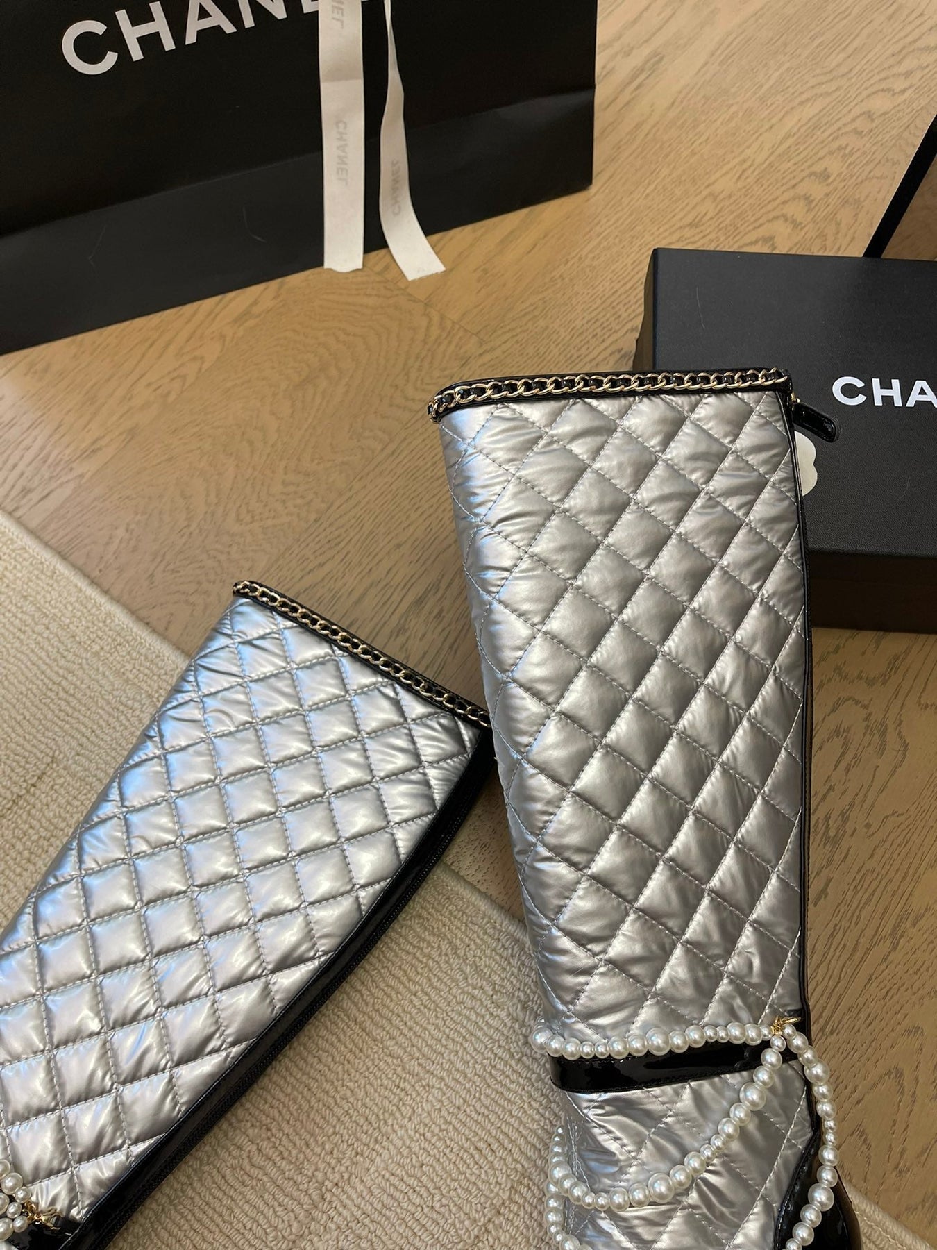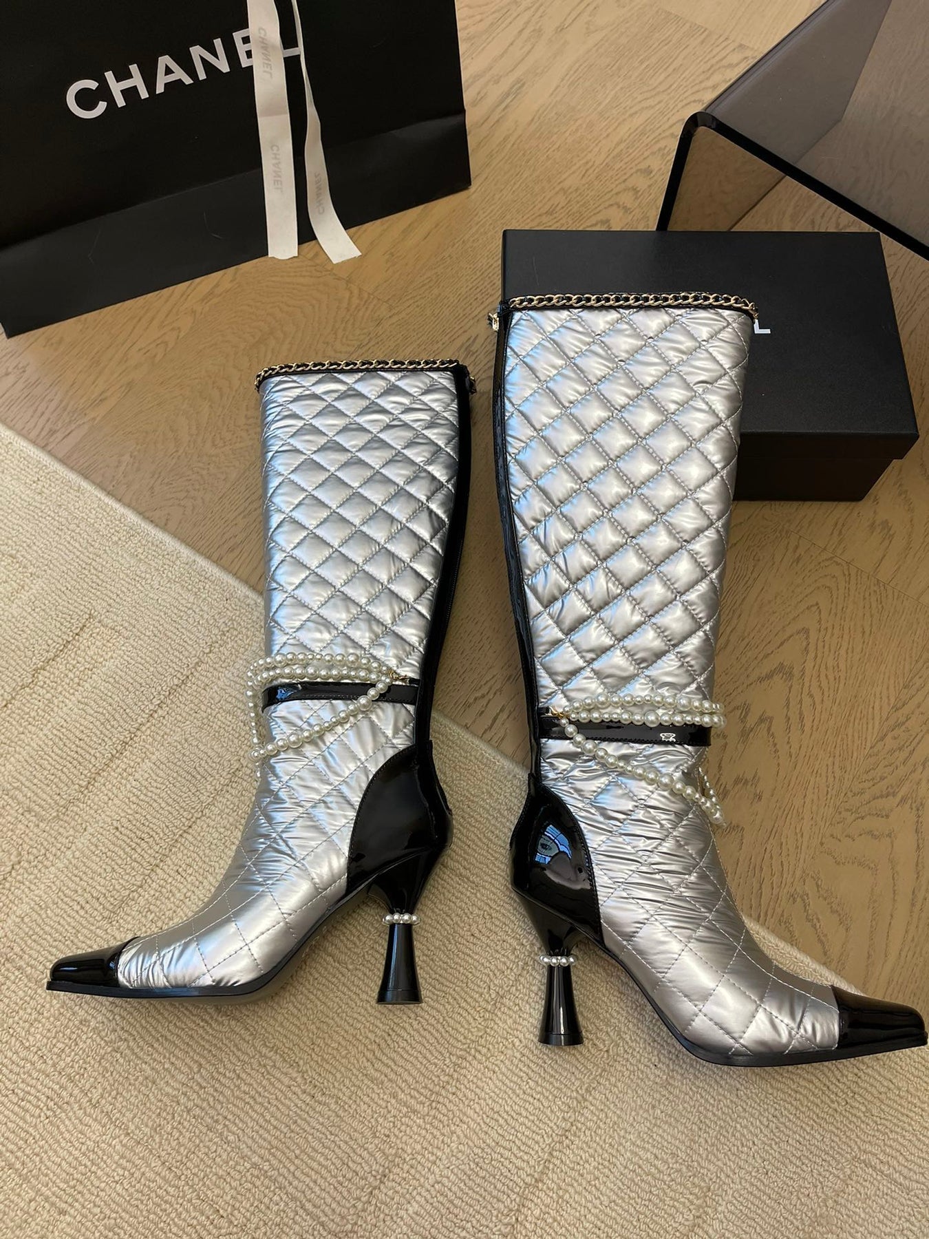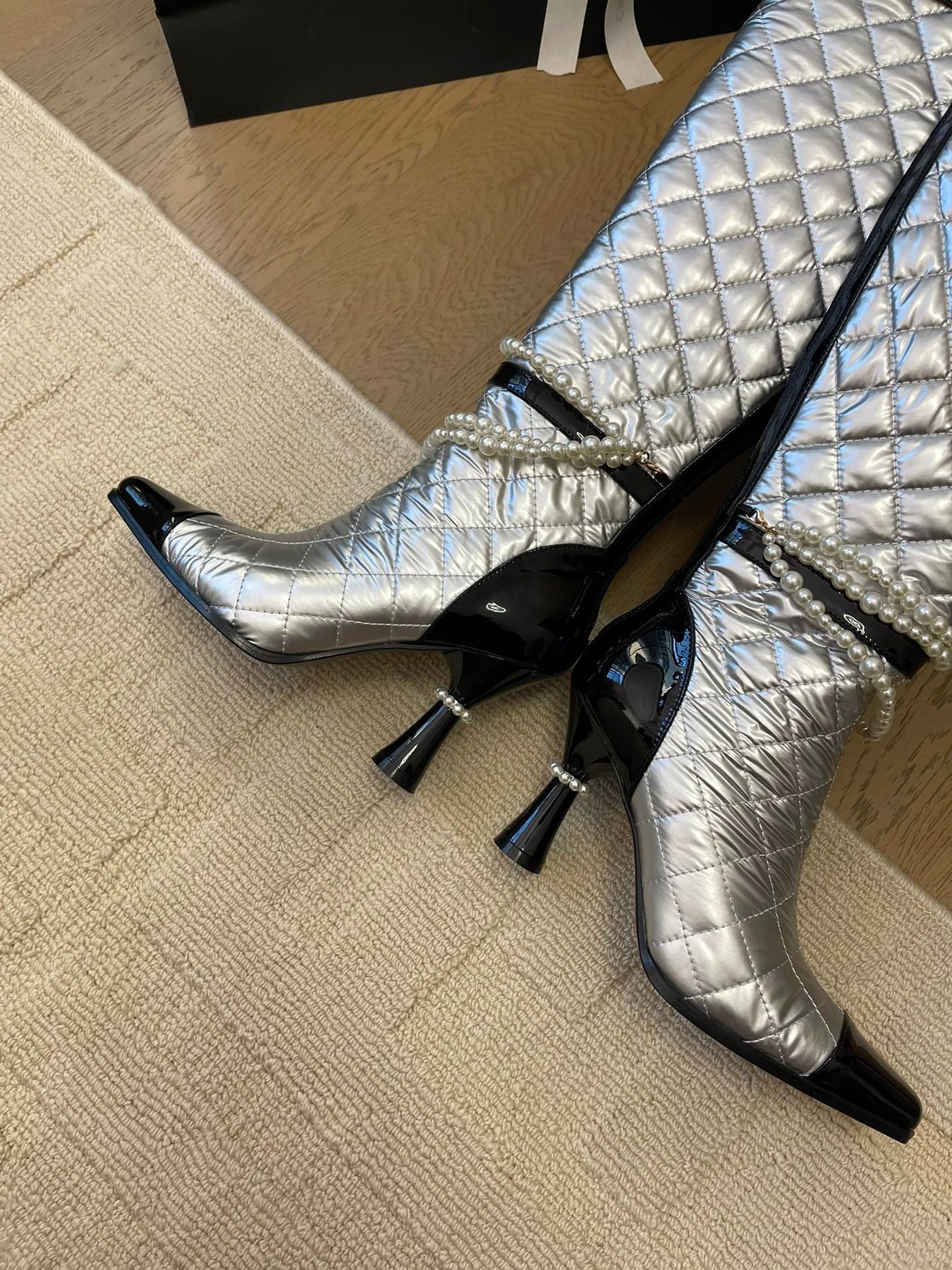 KNEE HIGH BOOTS 8 CM IN SILVER MIX BLACK CALFSKIN WITH PEARL CHAIN