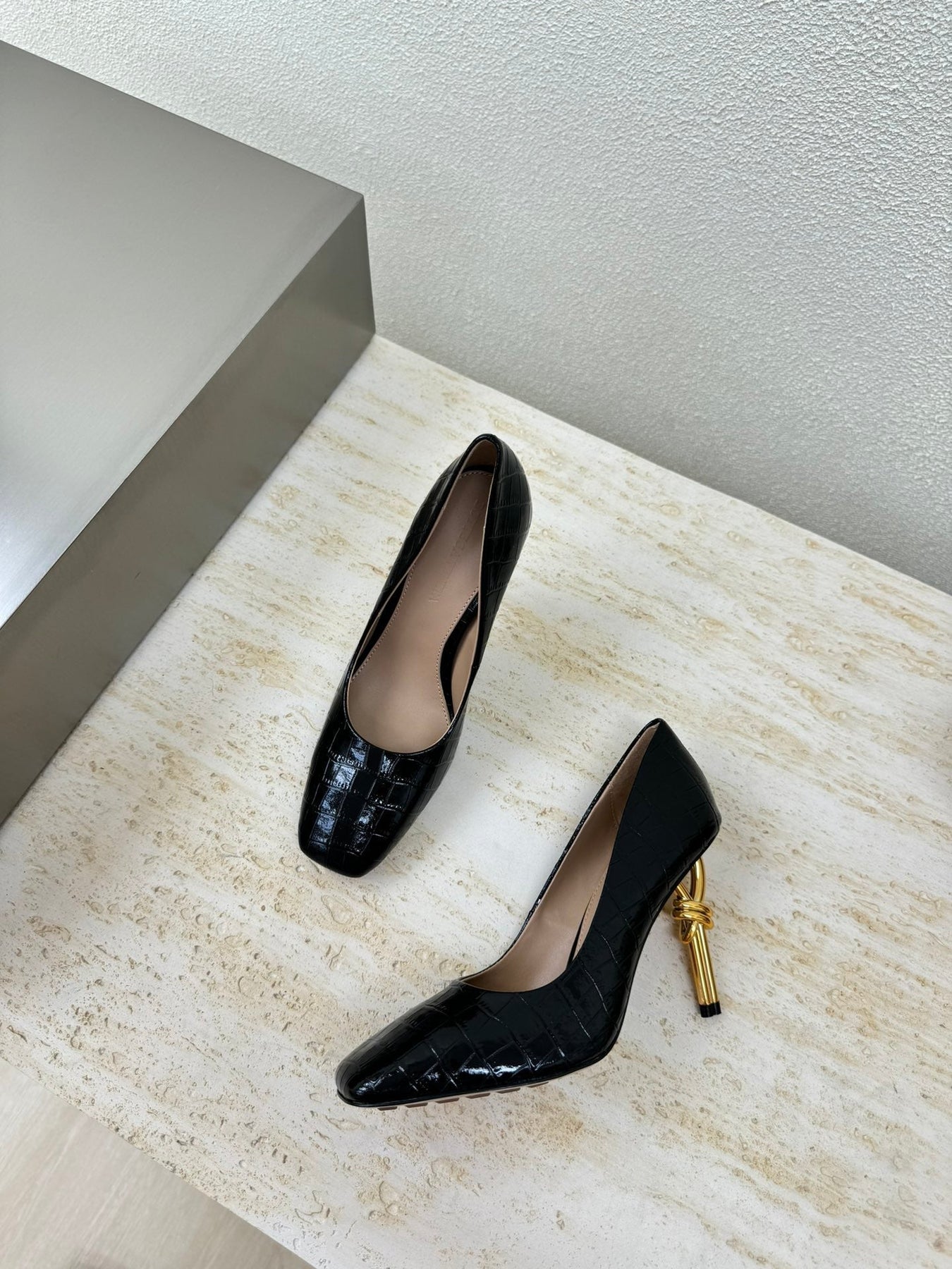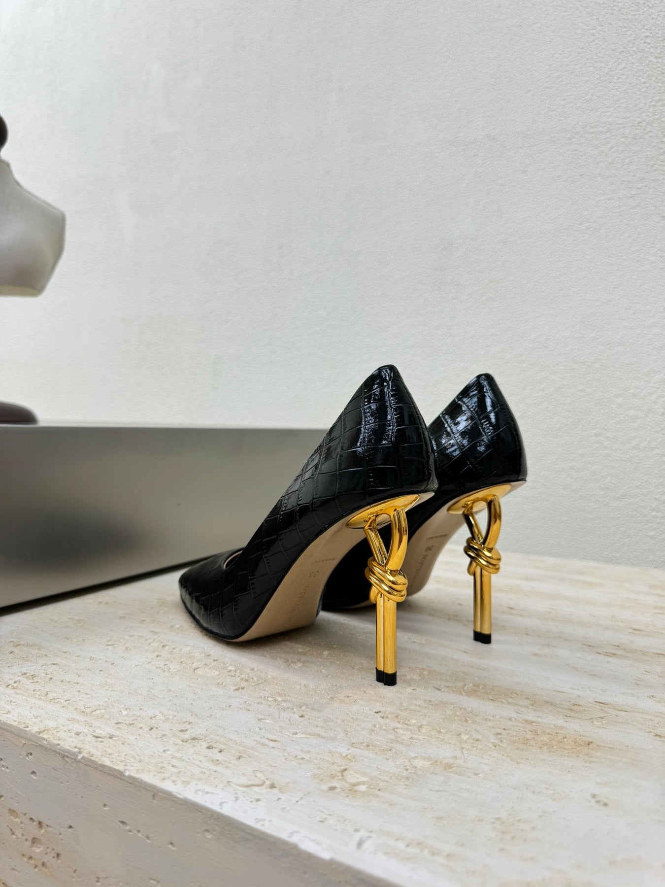 KNOT HIGH PUMP IN BLACK CALFSKIN WITH WOVEN DESIGN AND GOLD METAL HEEL 9 CM