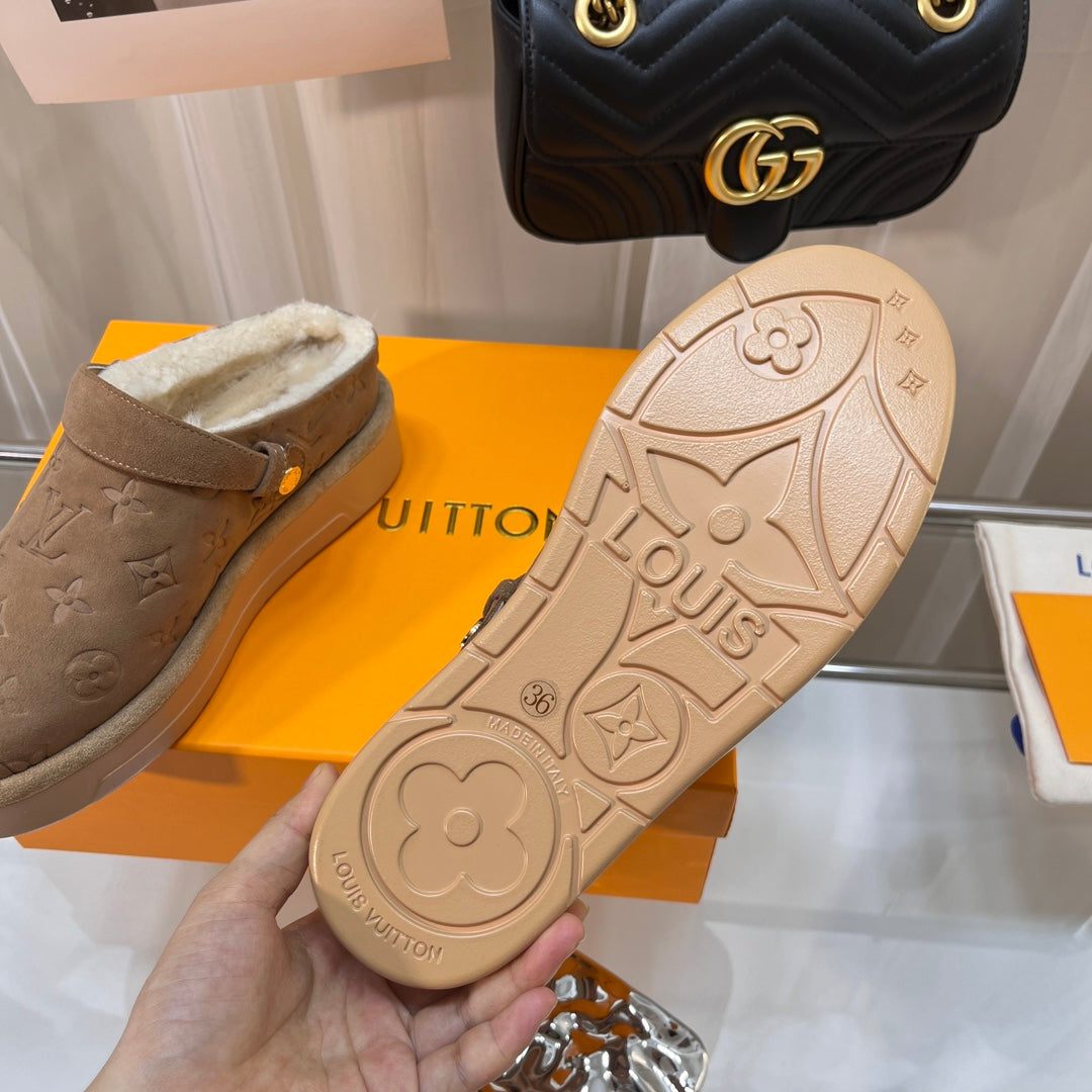 LV WOMEN'S COSY FLAT COMFORT CLOGS IN ASH BROWN MONOGRAM SUEDE