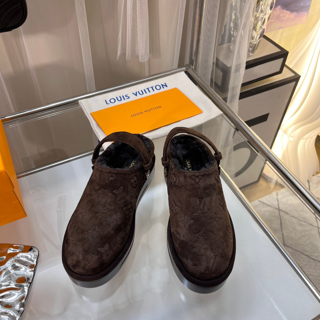 LV WOMEN'S COSY FLAT COMFORT CLOGS IN CHOCOLATE BROWN MONOGRAM SUEDE