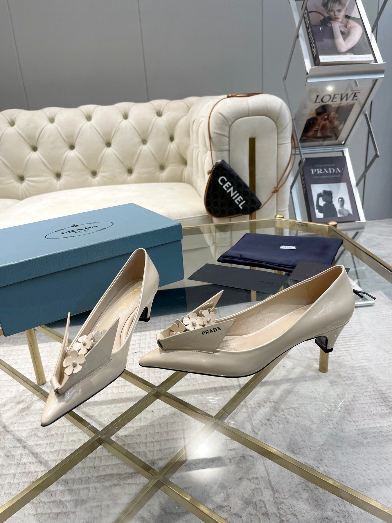 MEDIUM HEEL PUMPS IN BEIGE PATENT CALFSKIN ATTACHED CREATIVE FLOWERS
