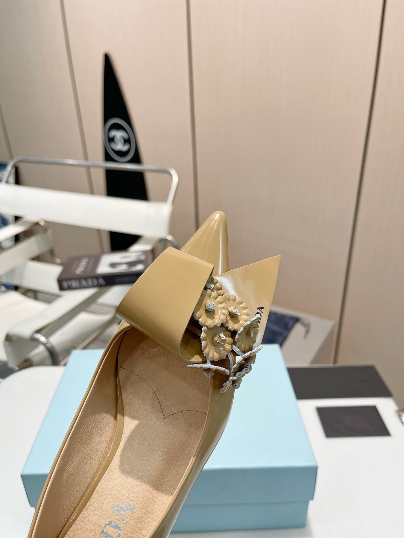 MEDIUM HEEL PUMPS IN TORTILLA BROWN PATENT CALFSKIN ATTACHED CREATIVE FLOWERS
