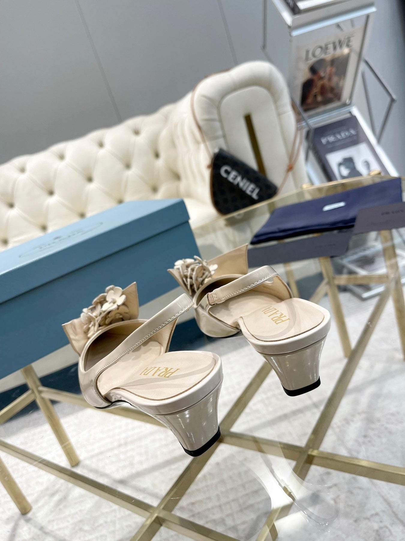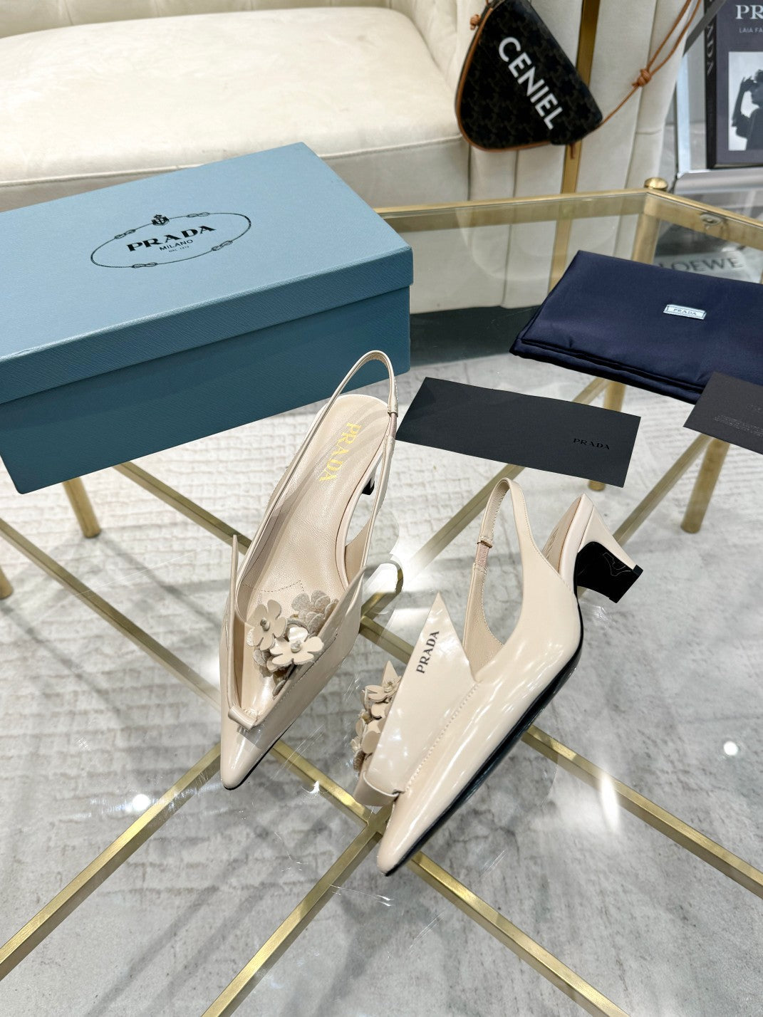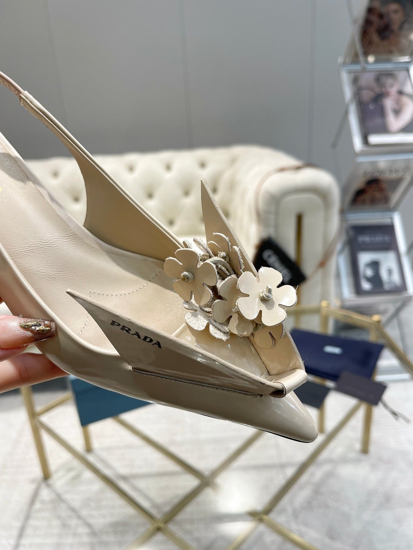 MEDIUM HEEL SLINGBACK ATTACHED CREATIVE FLOWERS IN BEIGE PATENT CALFSKIN