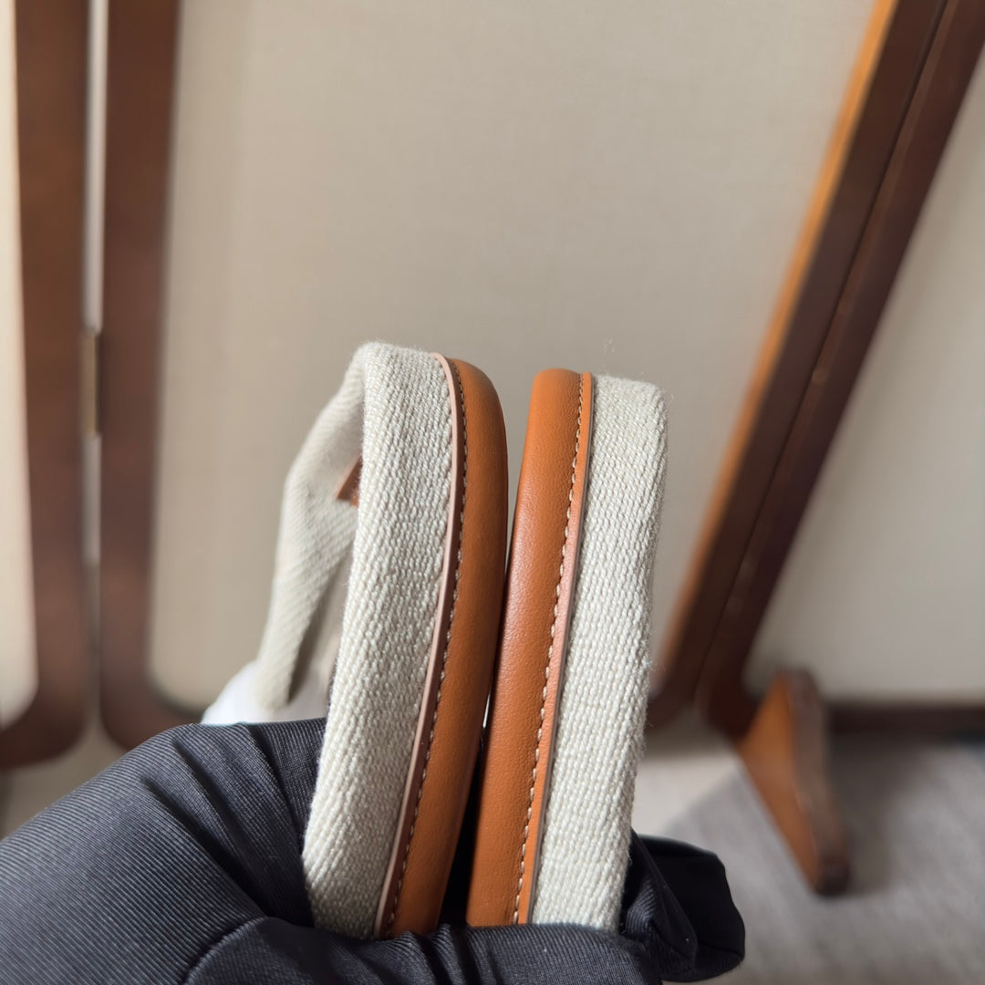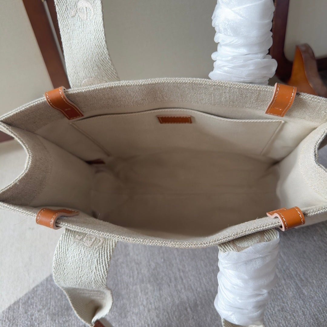 MEDIUM WOODY TOTE BAG 37 IN BEIGE LINEN CANVAS WEBBING LOGO EMBROIDERY BROWN CALFSKIN