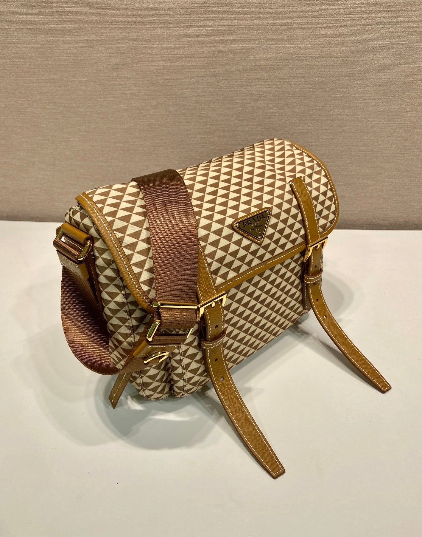 MESSENGER BAG 25 IN BROWN MIX CREAM TRIANGLE PATTERN EMBROIDERED FABRIC