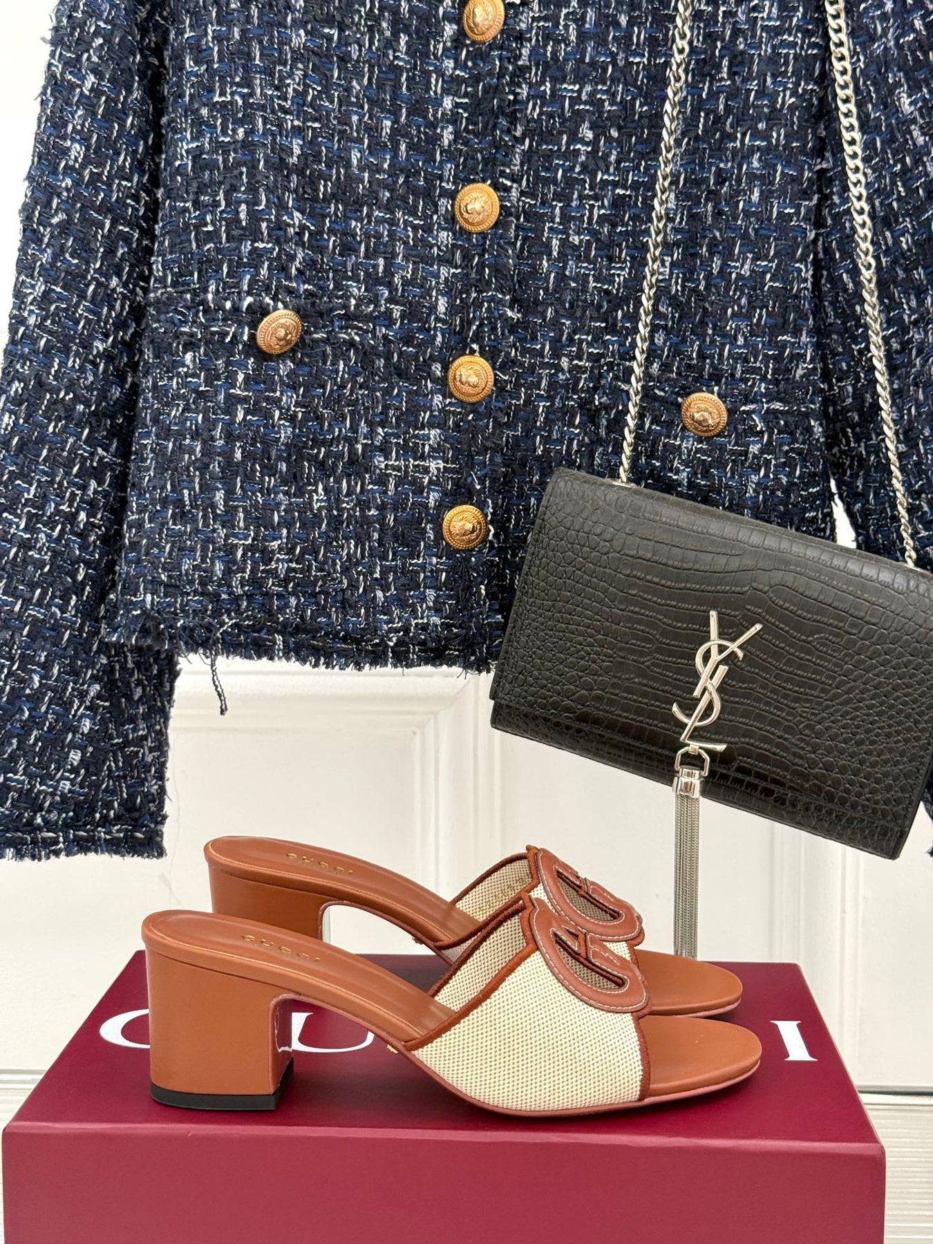 MID-HEEL MULE IN BROWN CALFSKIN AND CREAM WHITE FABRIC