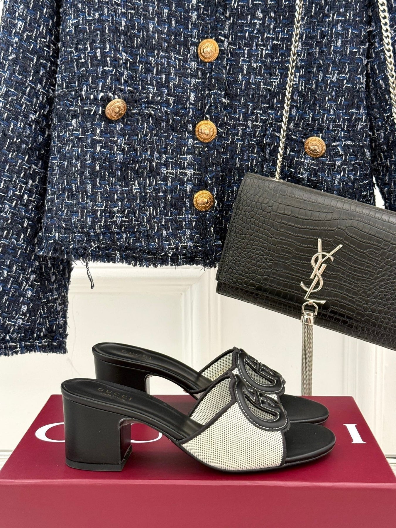 MID-HEEL MULE IN BLACK CALFSKIN AND CREAM WHITE FABRIC