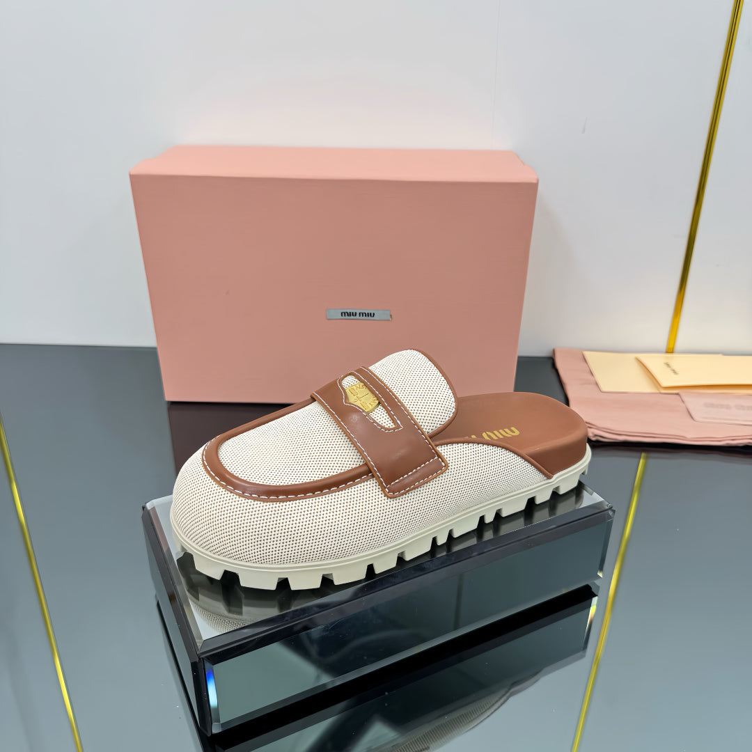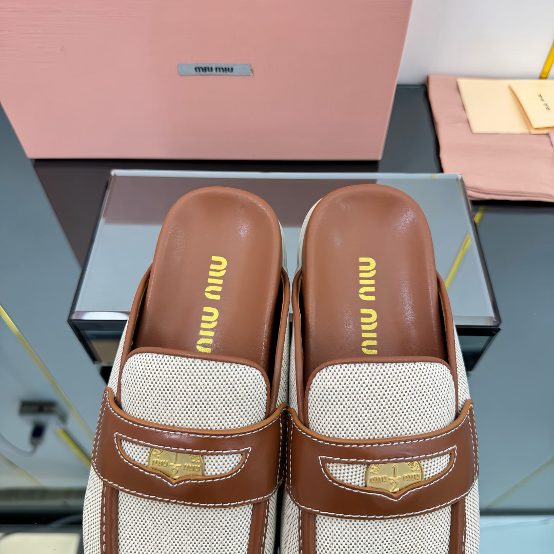 MULES SLIPPERS IN BROWN CALFSKIN AND WHITE DOTS CANVAS WITH GOLD COIN