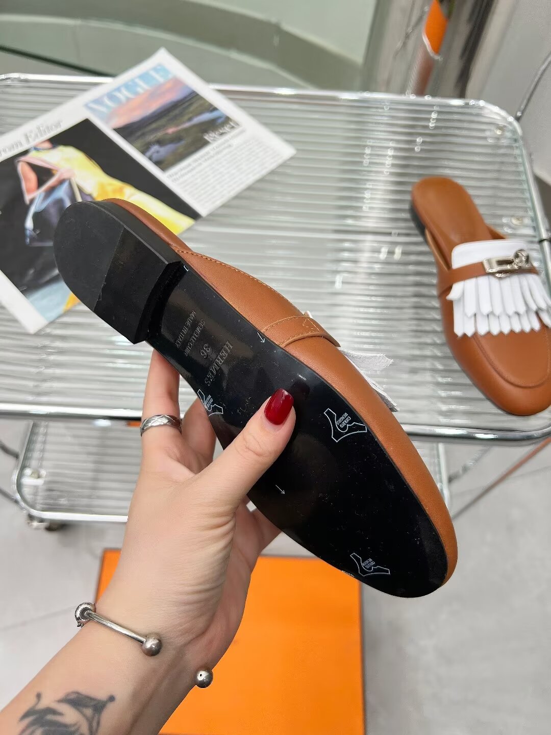 OZ MULE CARAMEL MIX FRINGED WHITE CALFSKIN