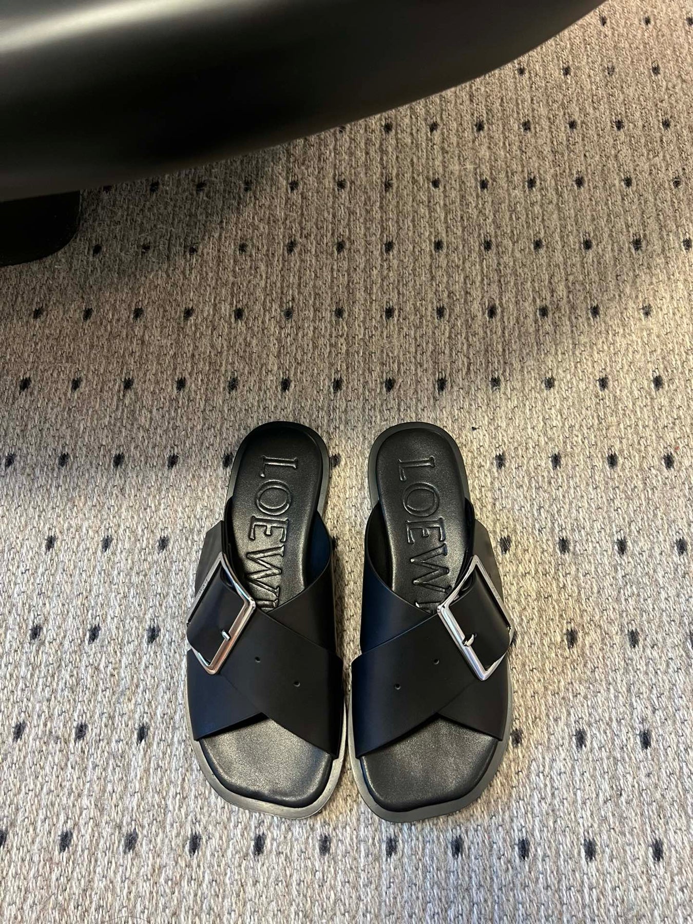PETAL BELT FLAT SANDAL IN BLACK CALFSKIN