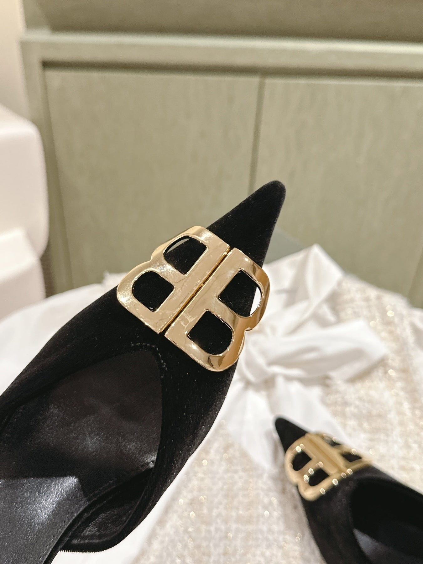 POINTED BB GOLD BUCKLE HIGH MULES IN BLACK VELVET