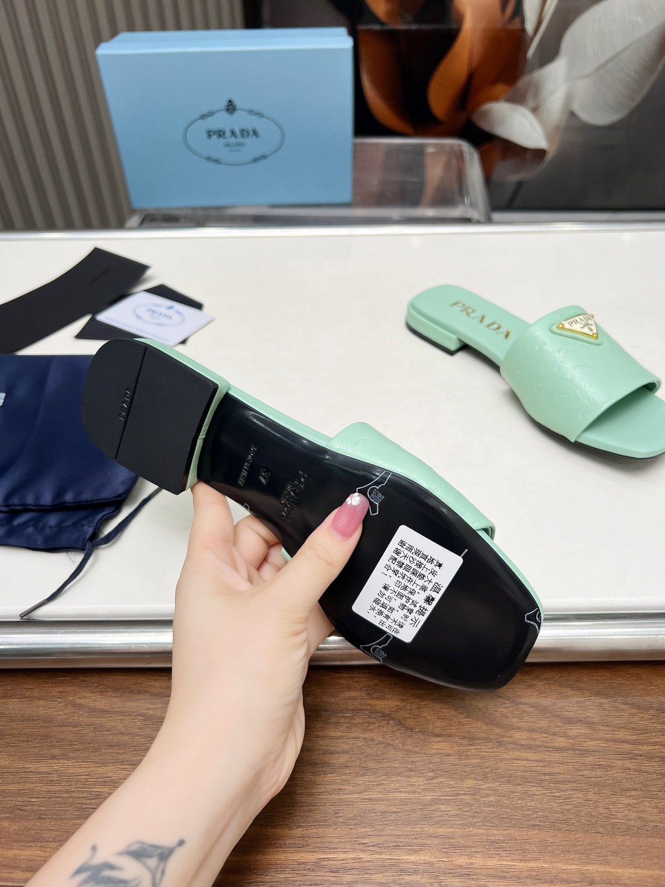 PRA SAFFIANO PATENT SLIDES OSTRICH MOTIF SEAFOAM CALFSKIN