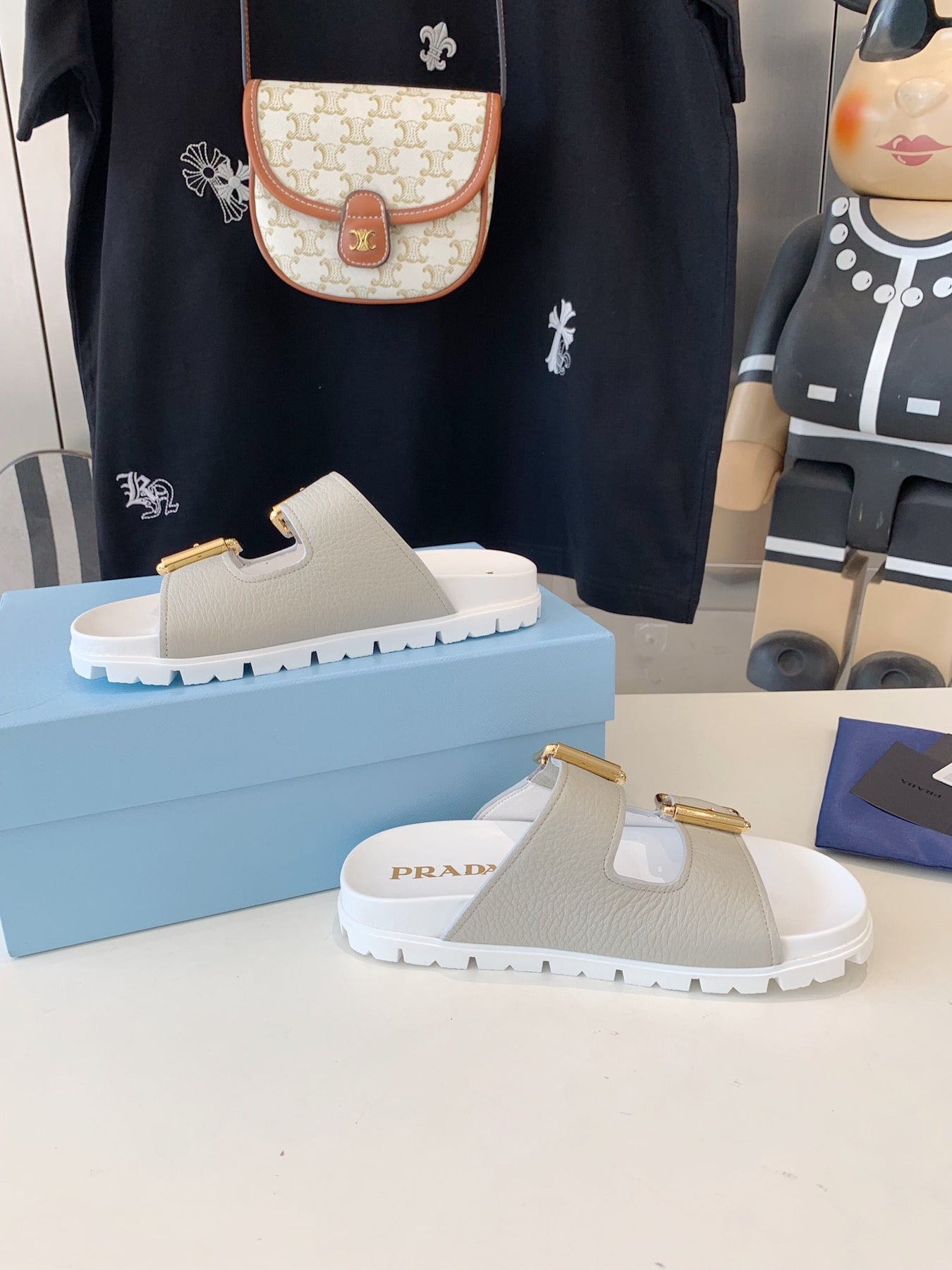 PRA STRAP SLIDES SANDALS WHITE AND LIGHT GRAY SUEDE
