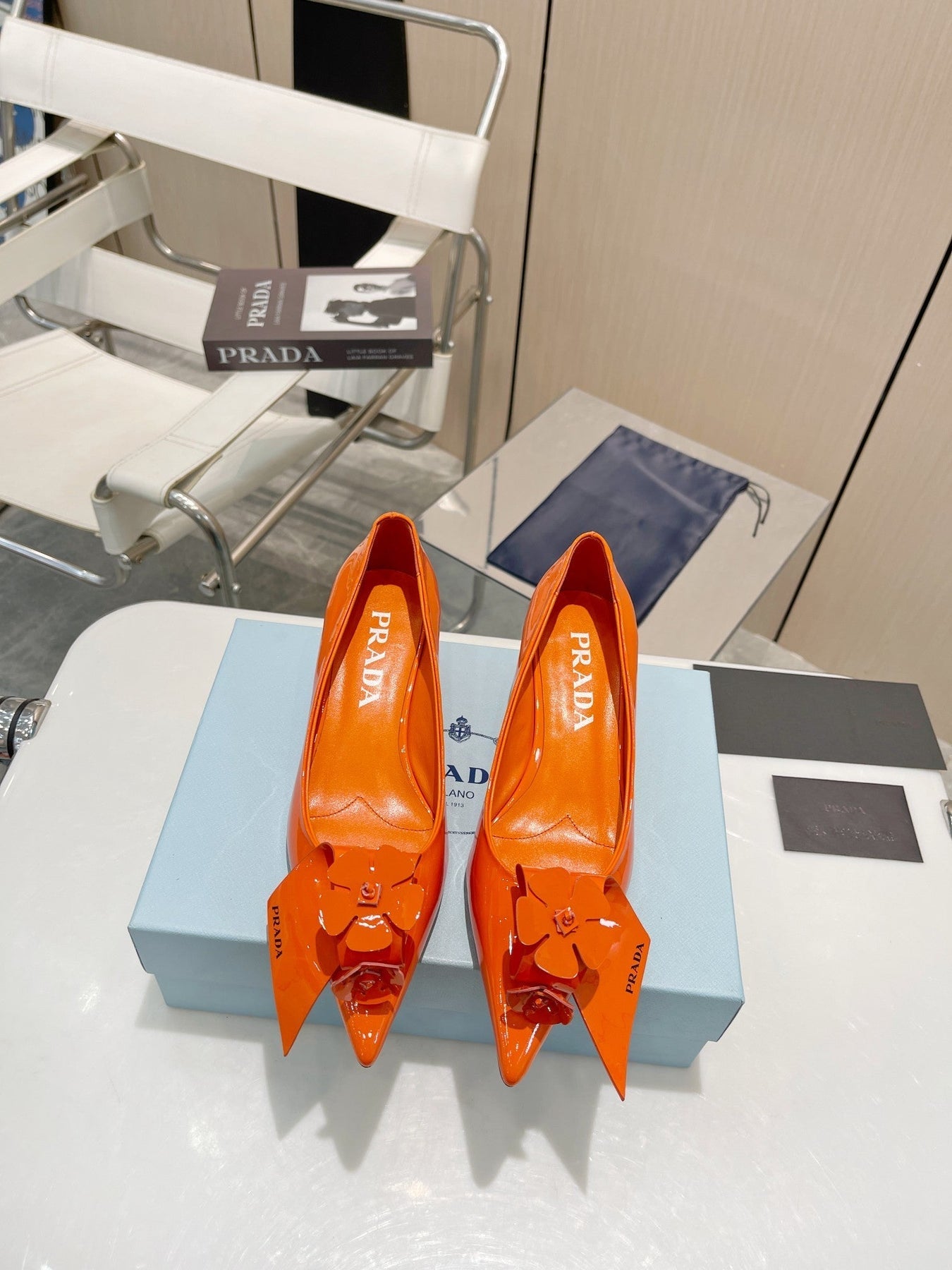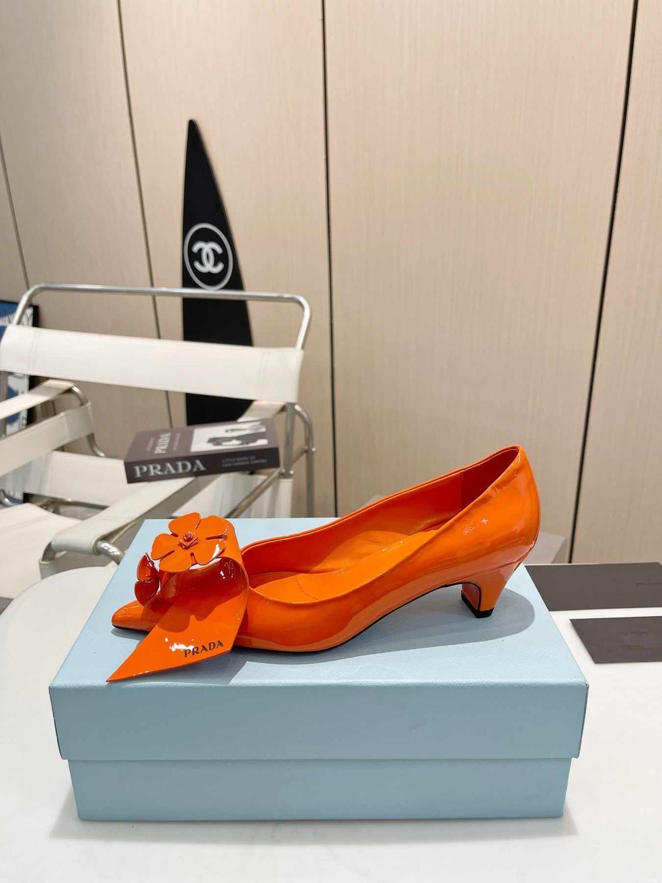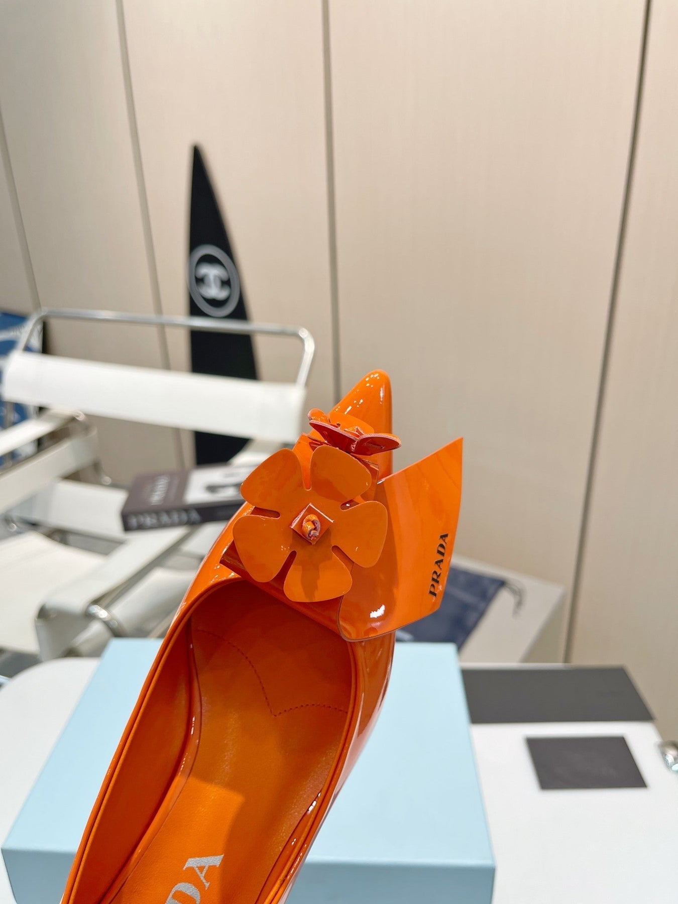 PUMPS KITTEN HEEL IN ORANGE PATENT CALFSKIN ATTACHED FLOWERS