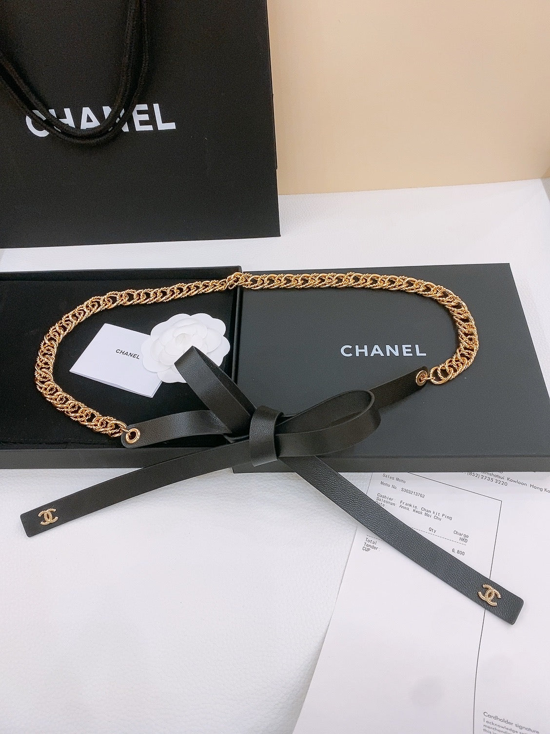 RIBBED BOW WAIST CHAIN IN GOLD TONE BRASS AND BLACK LAMBSKIN