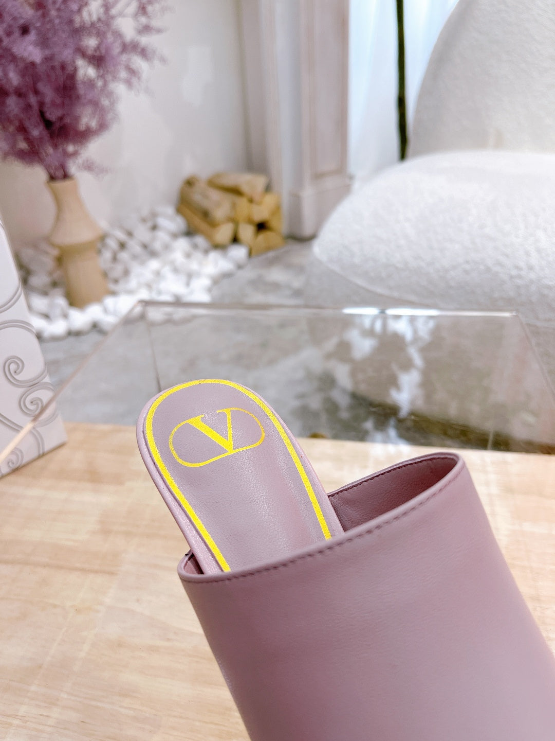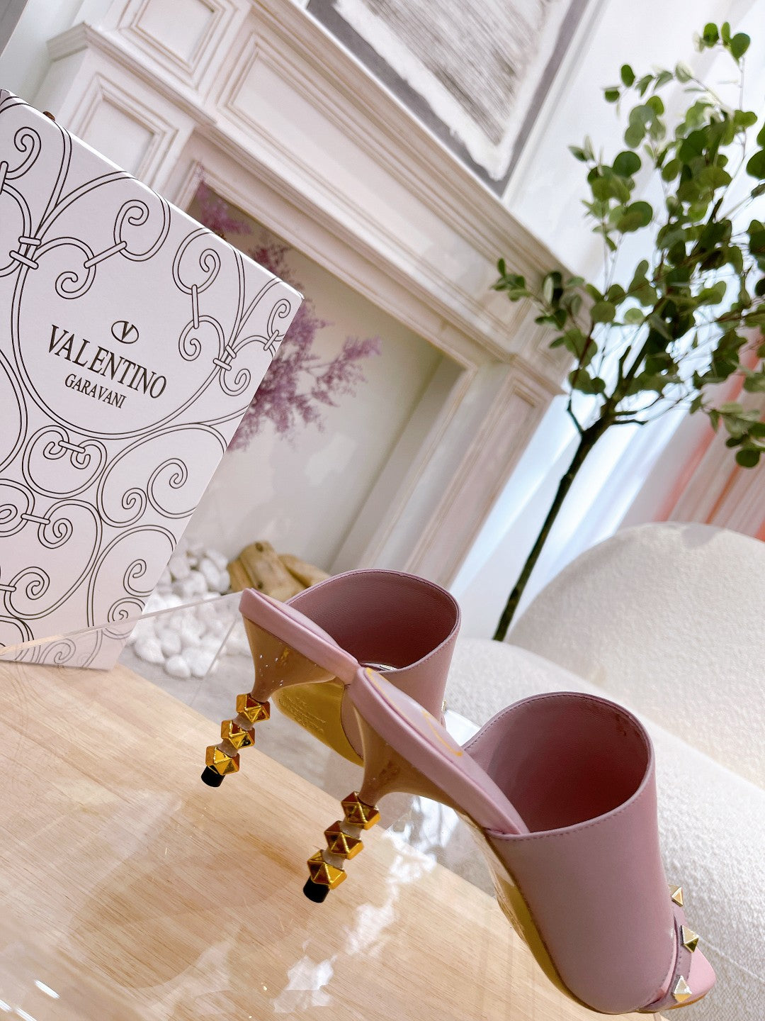 ROCKSTUD TOWER-HEEL MULES IN BABY PINK CALFSKIN 7 CM