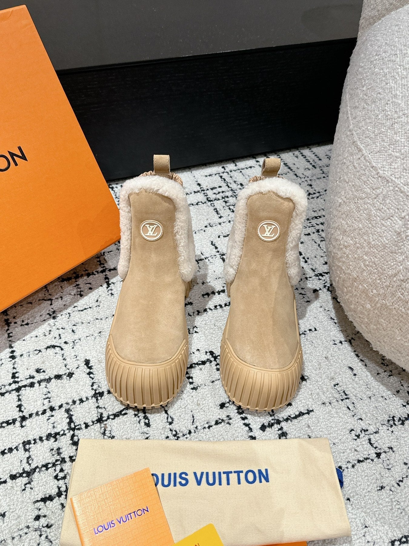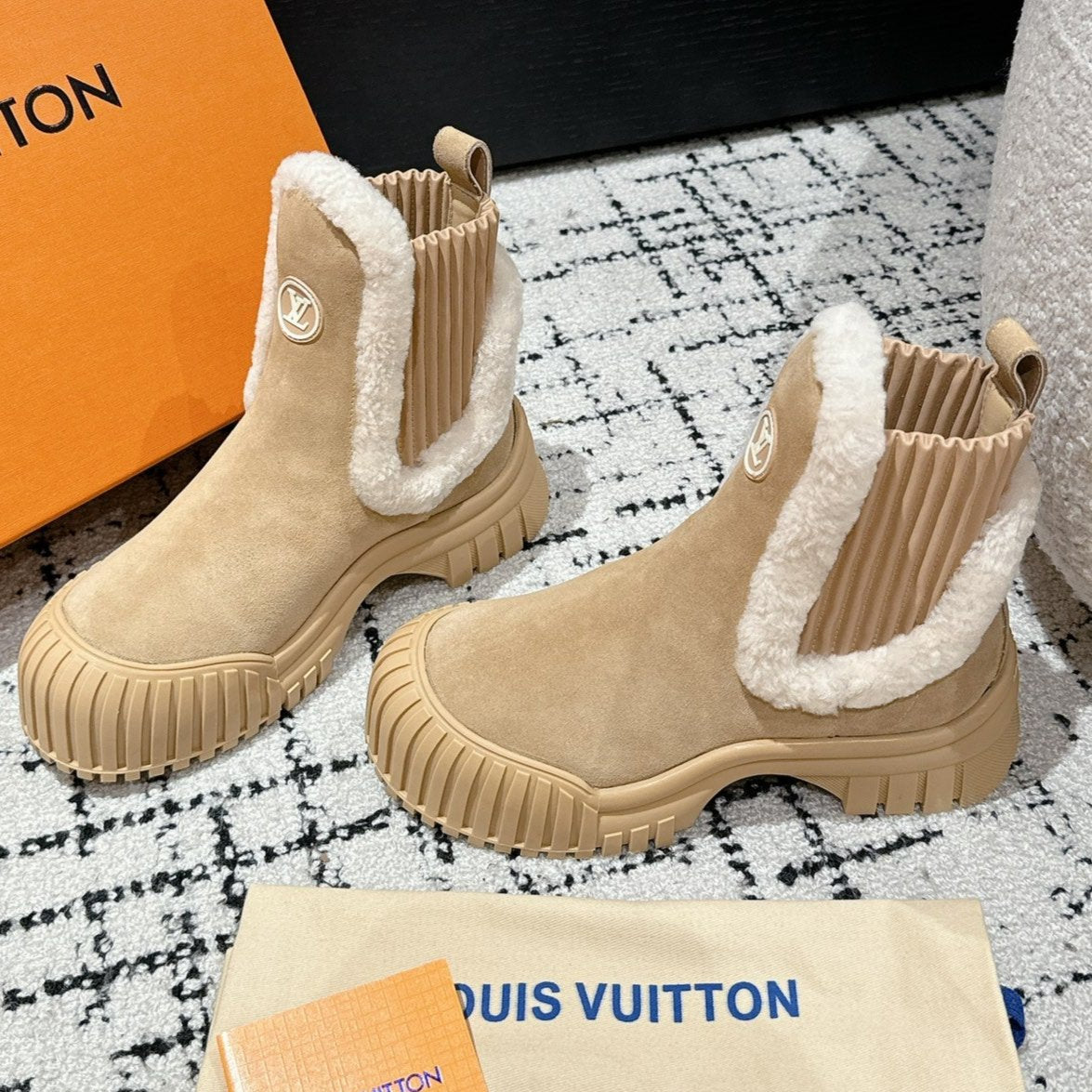 RUBY FLAT ANKLE BOOT IN TORTILLA BROWN SUEDE WITH WHITE SHEARLING